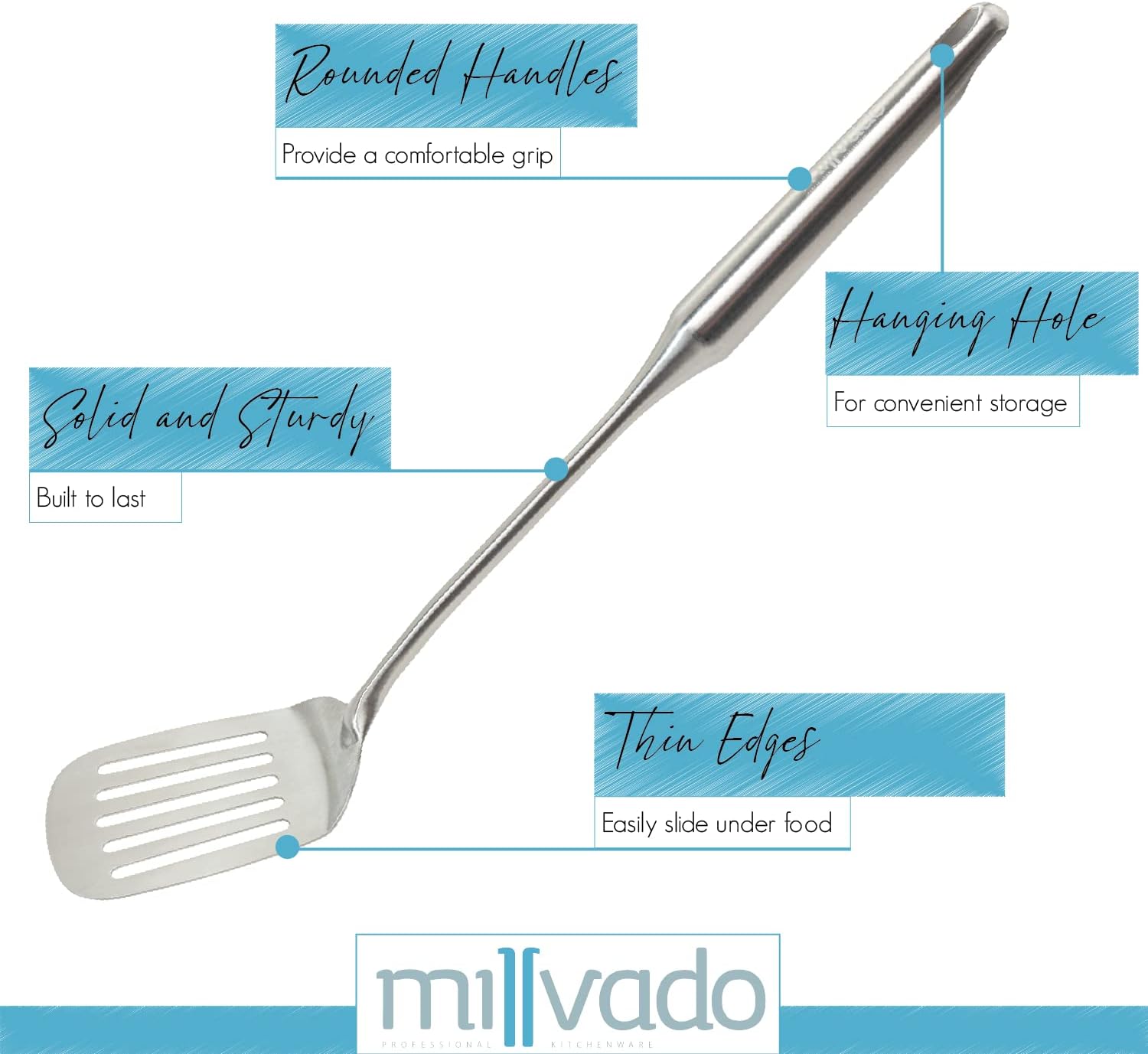 • SOLID STAINLESS STEEL: Stop your utensils from damaging your food and purchase the best metal spatula for cooking. While some utensils fray as they're used, this turner will maintain its glamorous look, even after much grilling, frying and flipping. Works well with a cast iron skillet or grill, too.