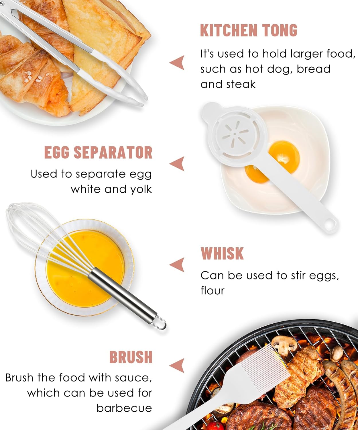 • ❤【12-Piece Kitchen Utensil Set】: This Set of 12 Essential kitchen Tools Includes 1 x Ladle,1 x Pasta Fork,1 x Spoonula,,1 x Slotted Spoon,1 x Kitchen Tong,1 x Slotted turner,1 x Whisk,1 x Brush,1 x Large Spatula,1 x Small Spatula,1 x spreader spatula,1 x Holder,All items except the tongs and whisk are built out of one solid piece of silicone, making them more durable and comfortable to hold.