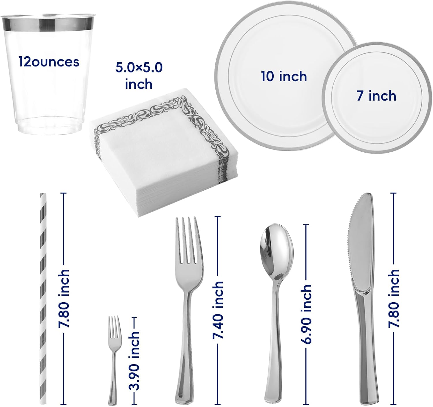 250 Count Silver Disposable Plastic Dinnerware Set, 50 Silver Plates, 25 Plastic Silverware, 25 Cups and Straws, 50 Napkins, Perfect for Wedding Party