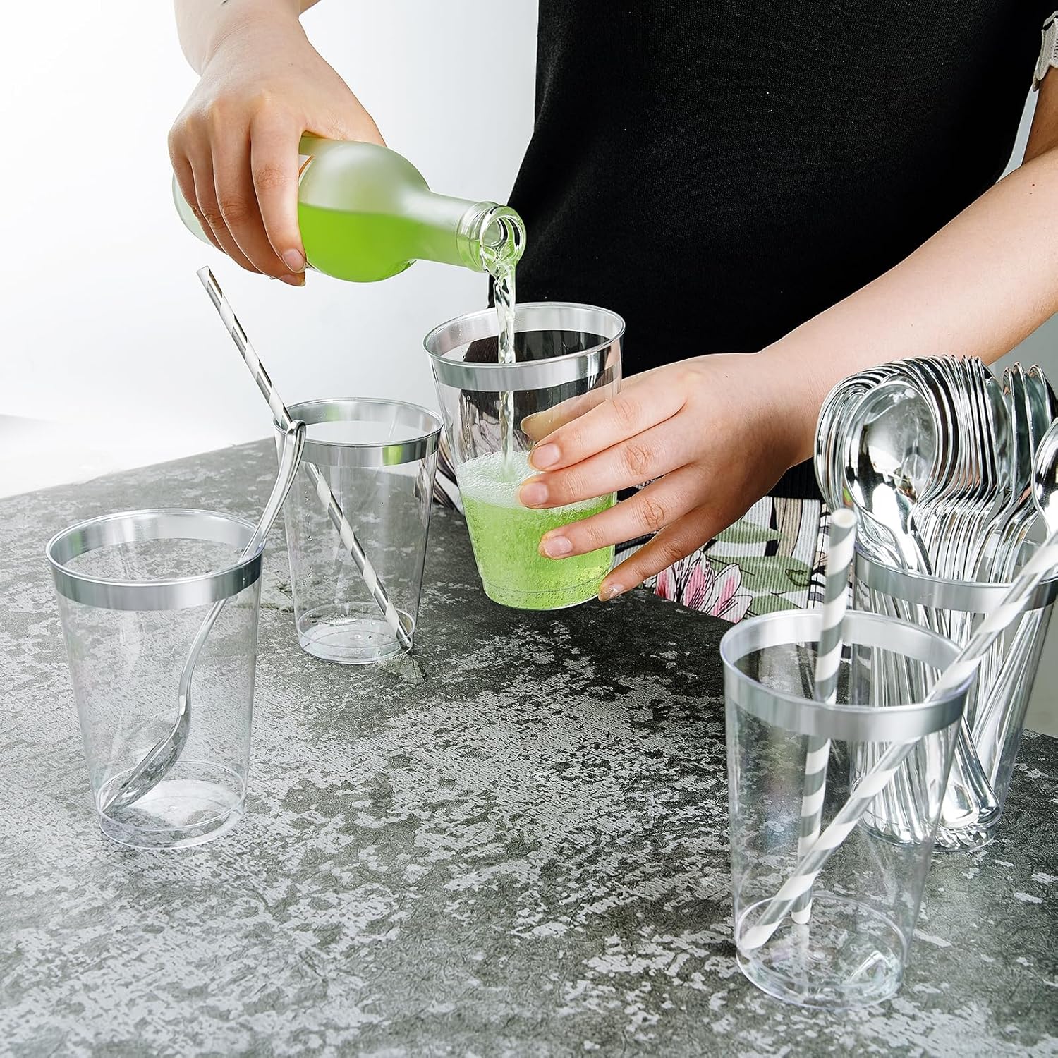• ELEGANT DESIGN: With a shiny finish will match well with the silverware, the cutlery radiates an exquisite shine while the decorative trim plates elevate your table exterior, and silver rim cups on the table make your party an elegant modern touch
