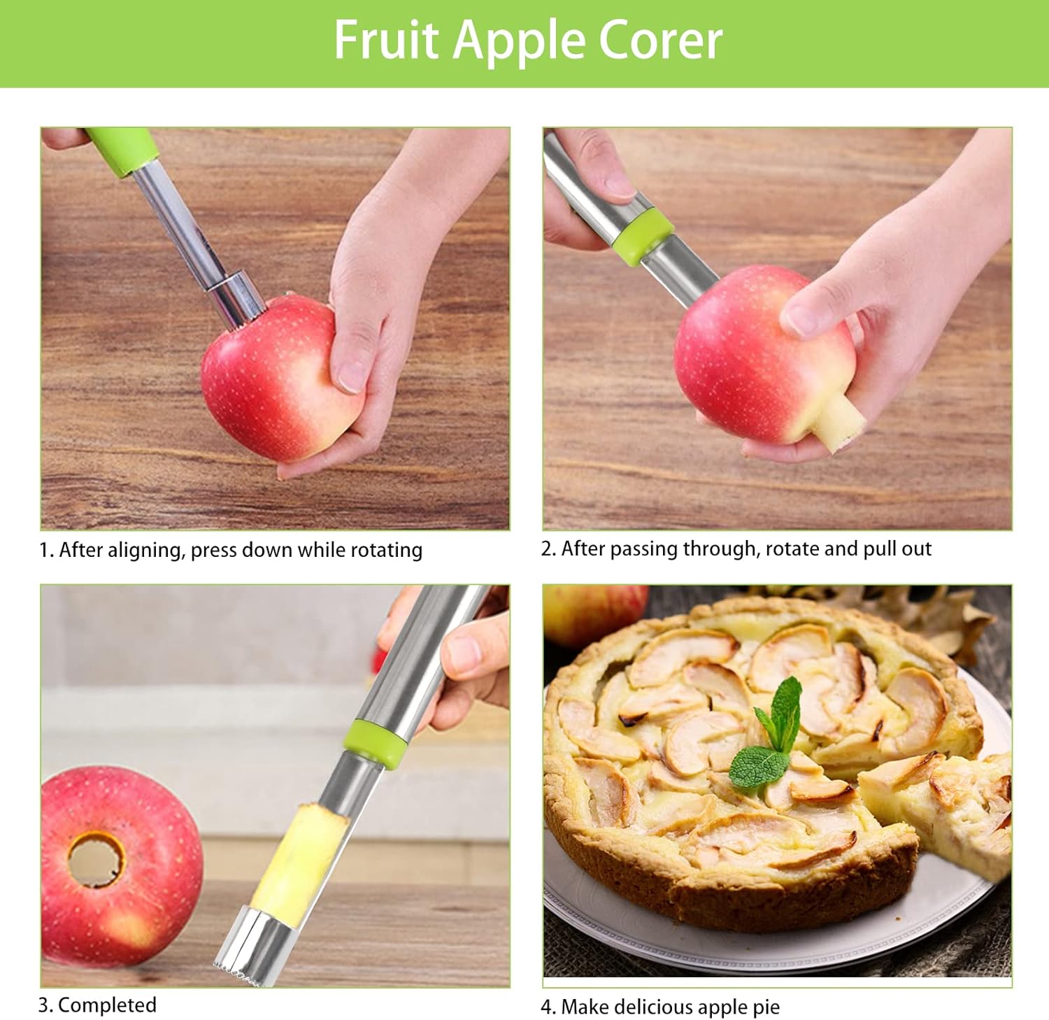• Fruit Corer Tool:Still struggling to core apples? The cut of the fruit corer remover is neat and sharp. Simply place the corer at the center, push down until the blades pierce through, slightly twist and pull out. A perfect apple without core is complete. Go and enjoy the delicious apple pie.