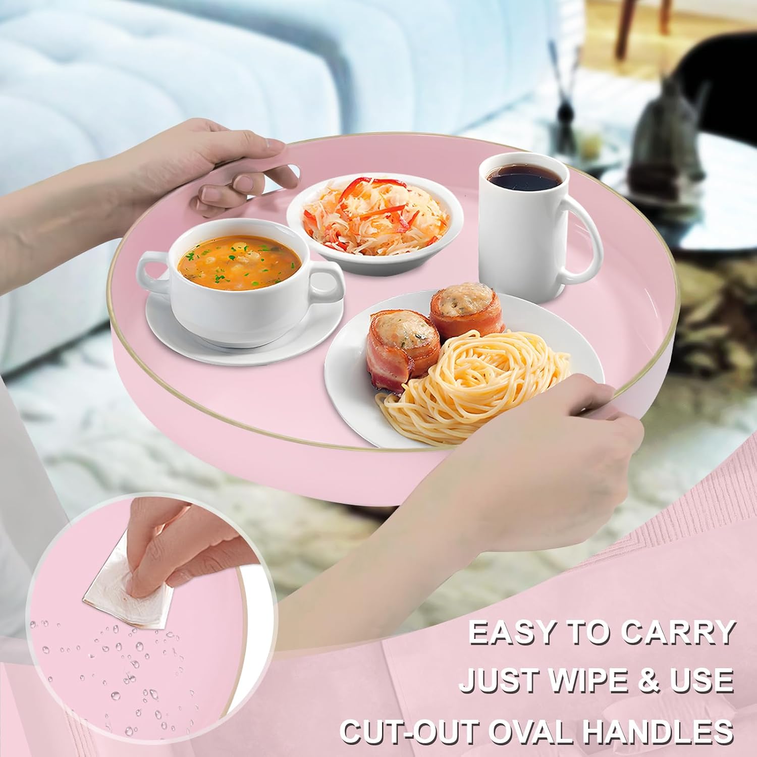 • LIGHTWEIGHT: Decorative serving tray is made of high-quality plastic, durability and lightweight. Pink round tray with built-in oval handles that are comfortable to grip and carry while avoiding any strain on your fingers. The serving tray for ottoman has surrounding 1.6" tray lips that prevent items from falling over.