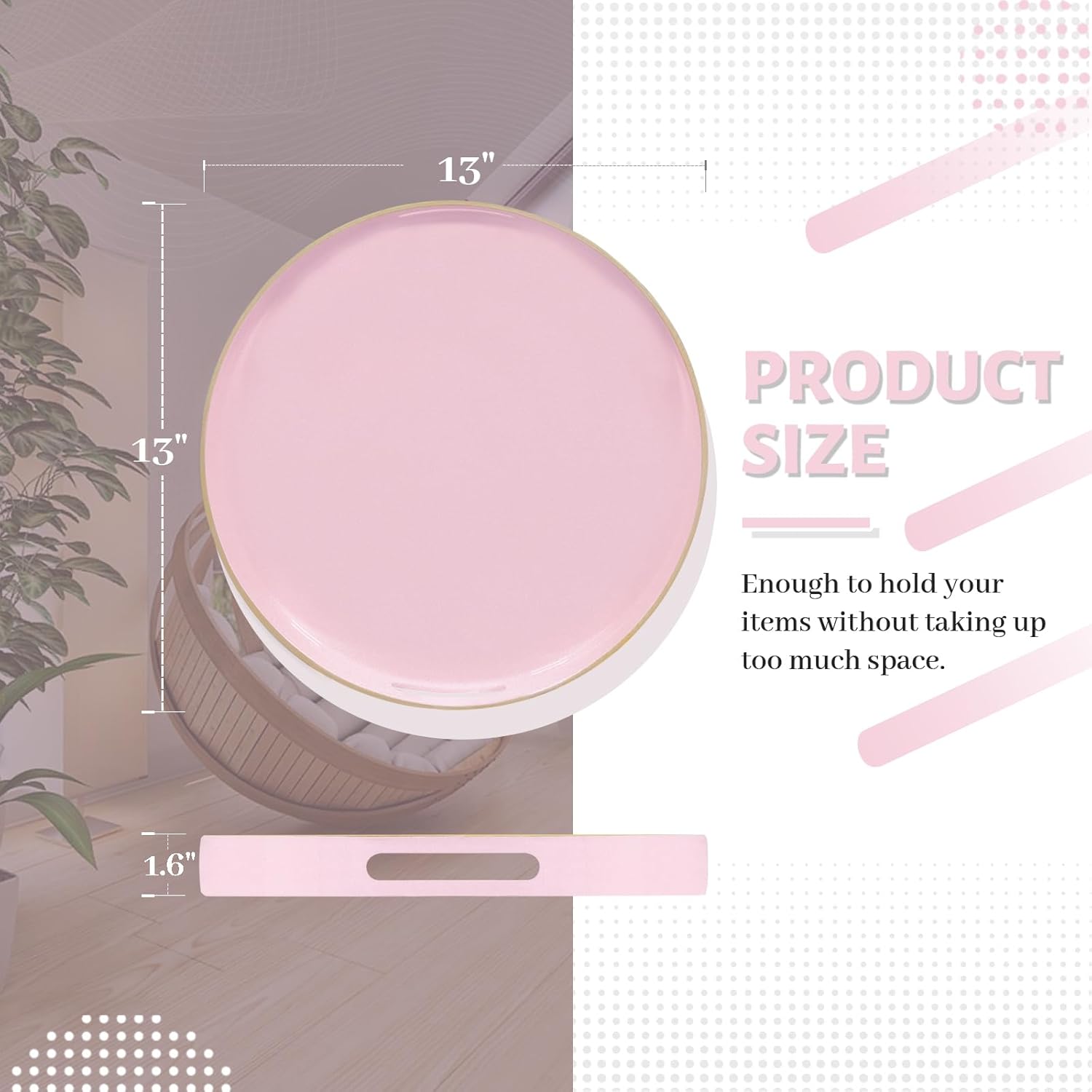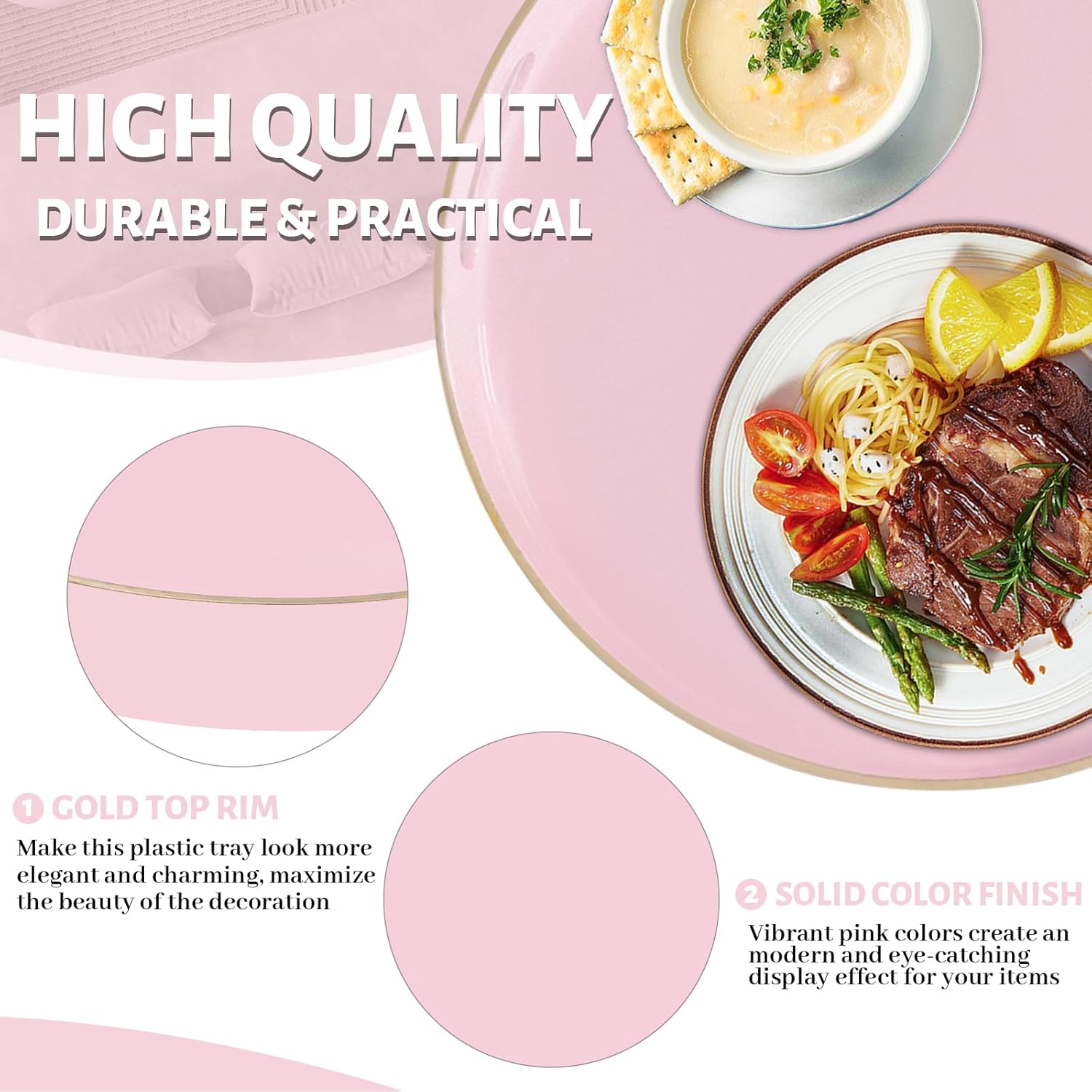 • TRAY DECOR: Pink tray is often used to present food and drinks in an appealing and organized manner. Round table tray can enhance the visual appeal of the items being served, making them more enticing to guests or customers. Also place it on your bathroom vanity as an exquisite showcase for perfumes, jewelry, or bath accessories.