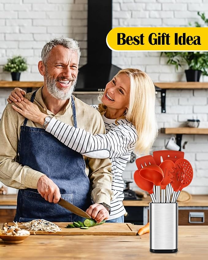 Silicone Cooking Utensil Set, 8Pcs Non-stick Cookware with Stainless Steel Handle, BPA Free Heat Resistant Kitchen Tools with Spatulas, Turners, Spoons, Skimmer and Pasta Fork (RED)