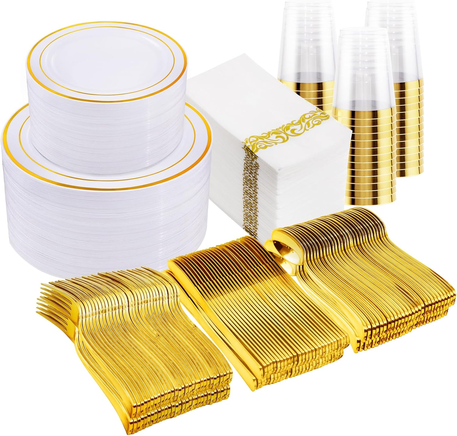 • Premium Choice: 100 guests gold party supplies are high quality, unbreakable, and can hold more food than paper plates, more affordable than renting china plates, what’s more, you don't bother with matching cups, cutlery and napkins.