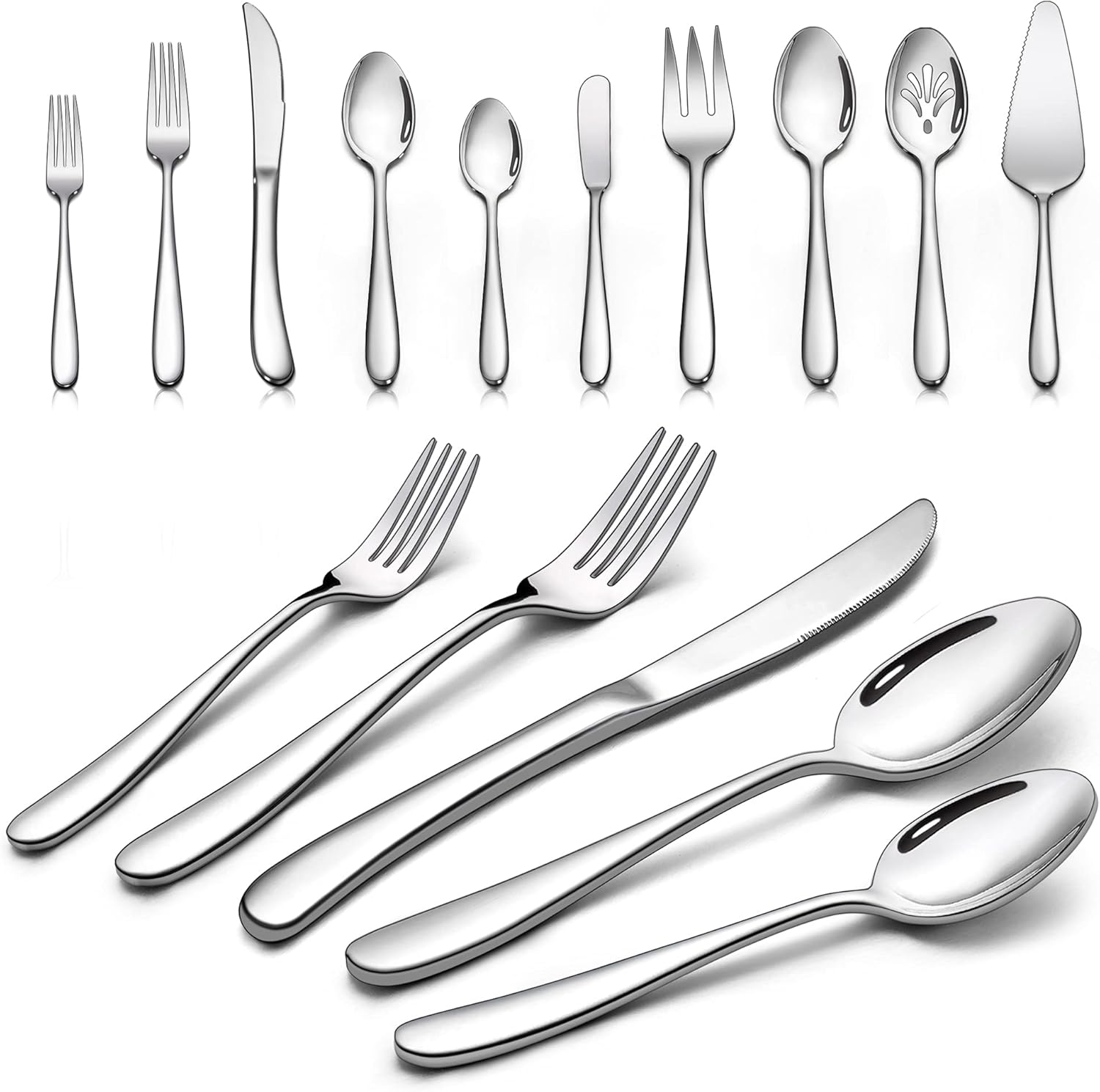 • Silverware set for 8, come with 40 piece cutlery set plus 5 hostess serving pieces, includes 8 dinner knife, 8 dinner fork, 8 dinner spoon, 8 salad fork, 8 tea spoon, serving spoon, slotted serving spoon, meat fork, pie server and butter knife