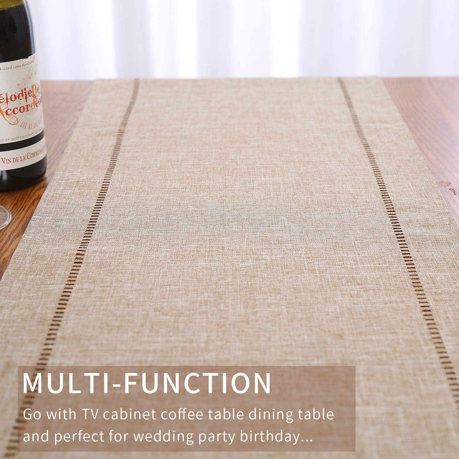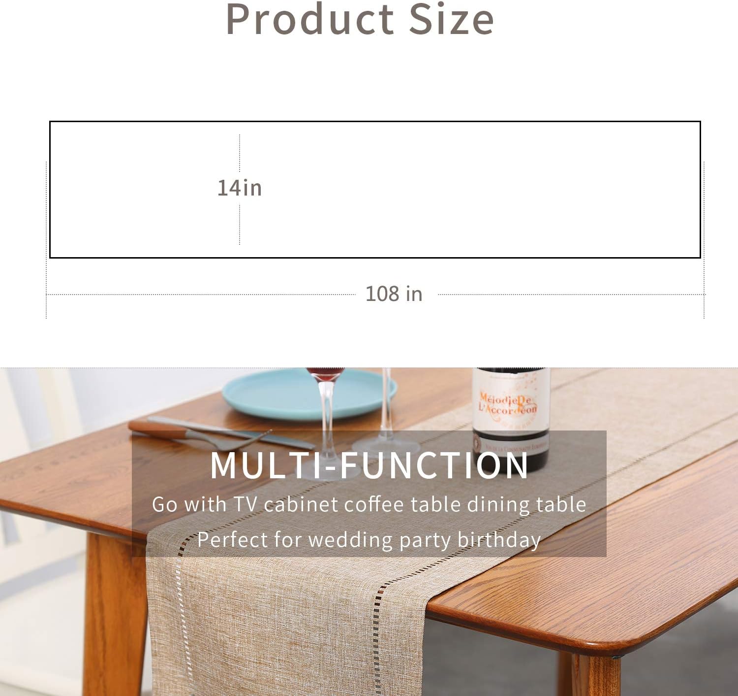 • PERFECT DECORATION - It's a natural and luxury feel table runner, very refined, durable and lightweight. Simple color that creates simple elegance. Size: 14 x 108 inches, Pack of 1. Perfect length for 4ft tables, dresser or mantel etc. Please allow 1-2cm deviation because of hand-cutting and sewing.