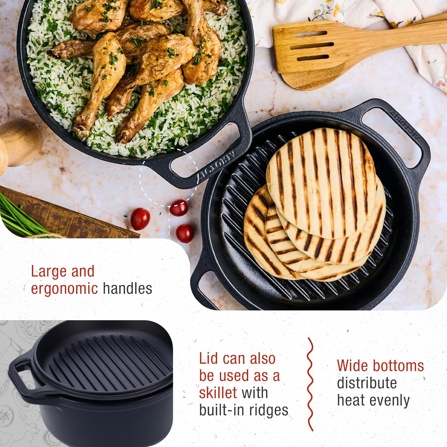 • MADE FOR GREAT MEALS: Our cast-iron pot set comes with a skillet that can be used for cooking or used as a lid. Both items feature large loop handles and flat, wide bottoms for more even cooking, and the skillet features built-in ridges for easy grilling.