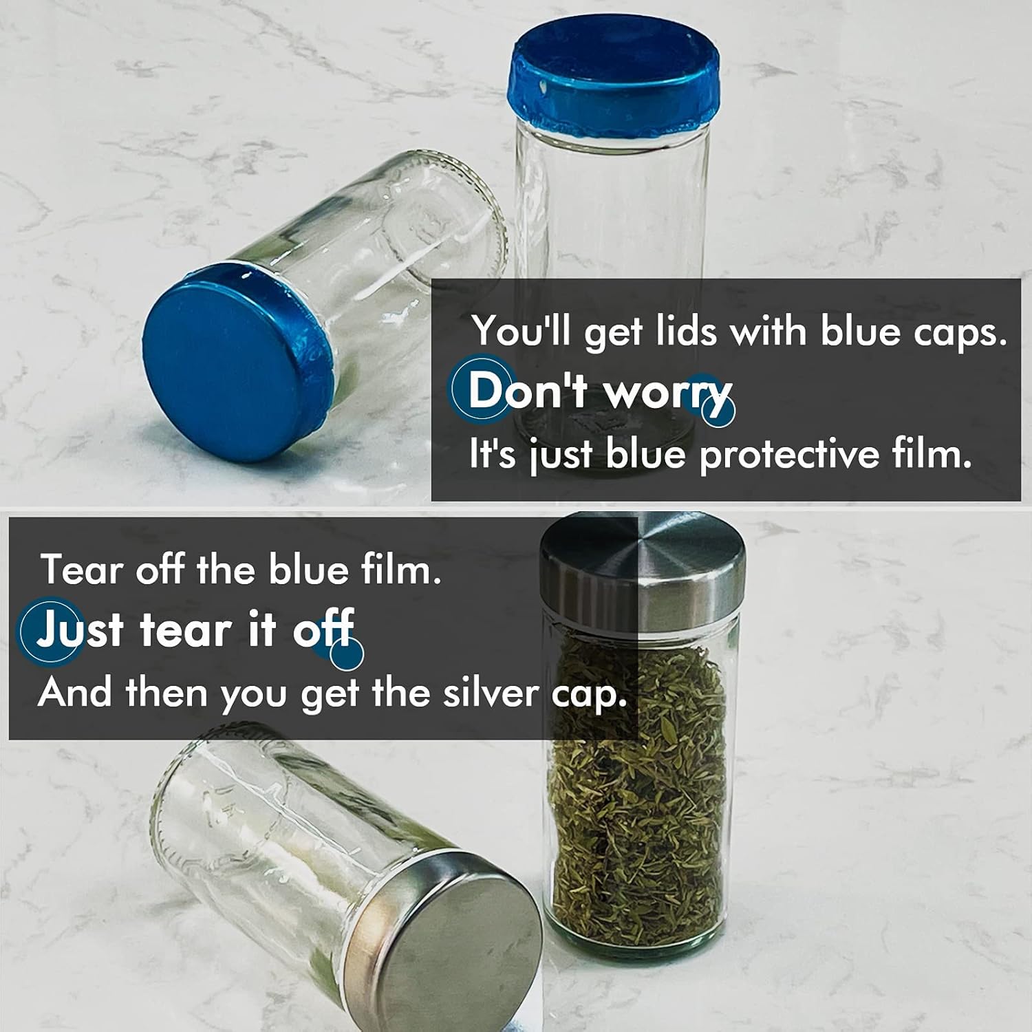 • Premium Safe Material - Heavy duty glass spice bottle jars are food grade material. To prevent the lids from being scratched, it’s sealed with blue protective plastic film. You’d better tear them off. with a stainless steel lip, You can turn the lid to use, or you can close it to keep your spices fresh.