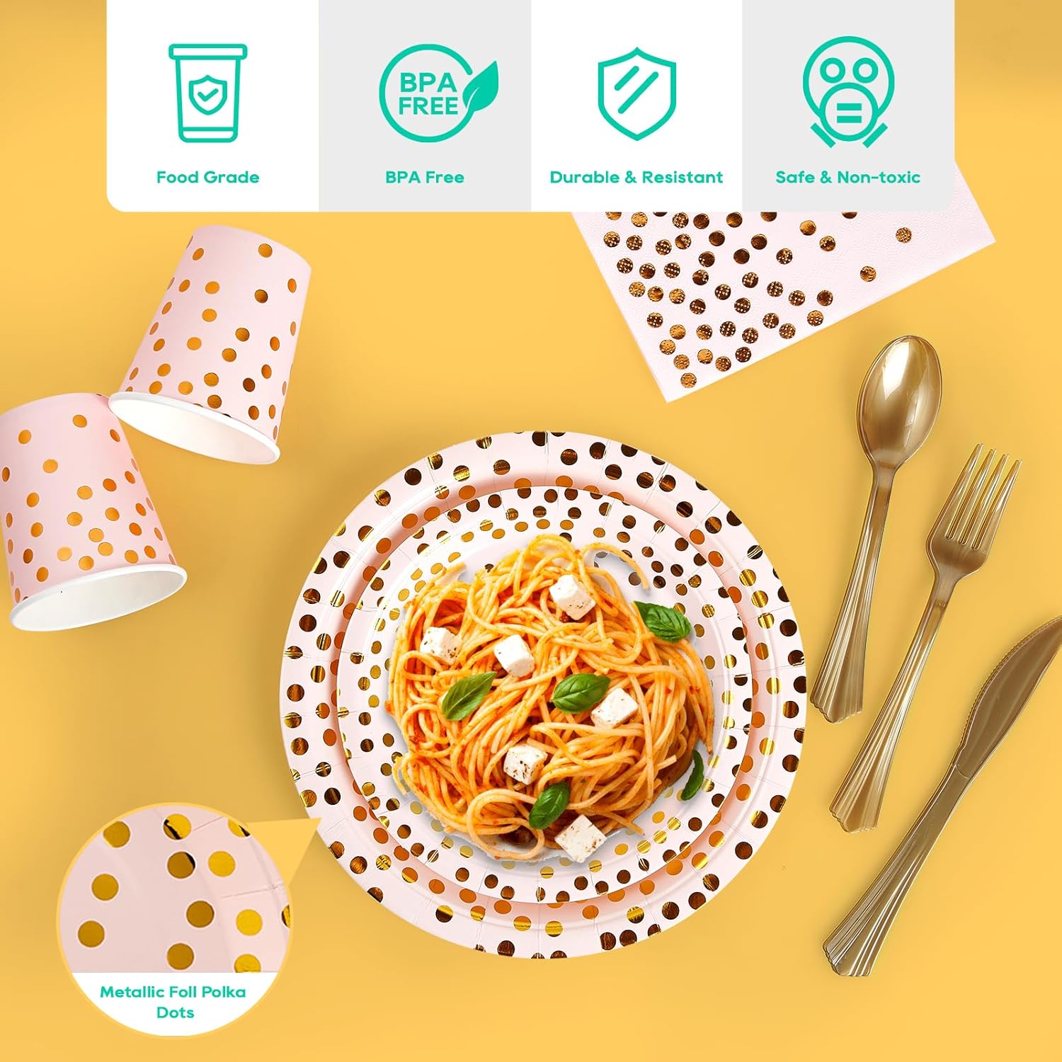 • 🎄🎄EXQUISITE AND ELEGANT DESIGN - Designed with a pink background and gold foil dot pattern, pink party supplies really add dimension to your parties. Gold plastic forks knives spoons adding an elegant, modern touch to any party. Perfect choice for a pink and golden-themed party