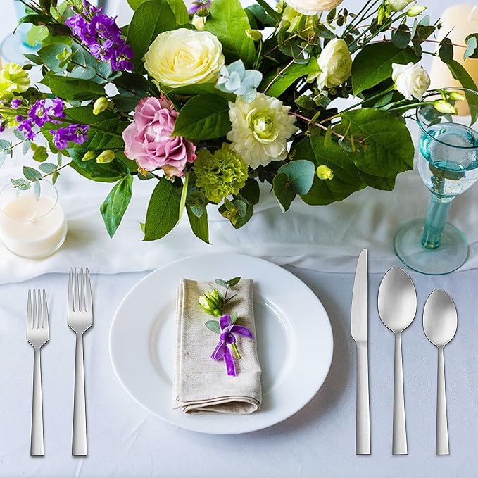 • Matte silverware, all the pieces feature with brushed finish surface, unique square edge handle with ergonomics design offers a good grasp, modern look match well with your table setting, fancy silverware would enhance your dining experience well