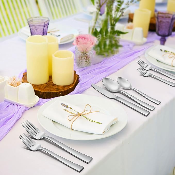 • Matte silverware, all the pieces feature with brushed finish surface, unique square edge handle with ergonomics design offers a good grasp, modern look match well with your table setting, fancy silverware would enhance your dining experience well