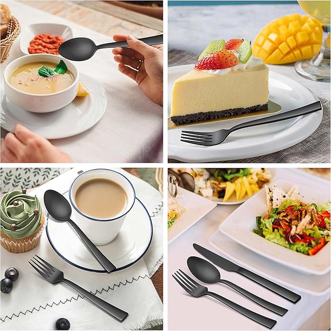 • Matte black silverware, all the pieces feature with brushed finish surface, depending on the refraction of light, it looks from dark gray to black, which makes it more fashionable than ordinary cutlery, and fancy silverware would enhance your dining experience well