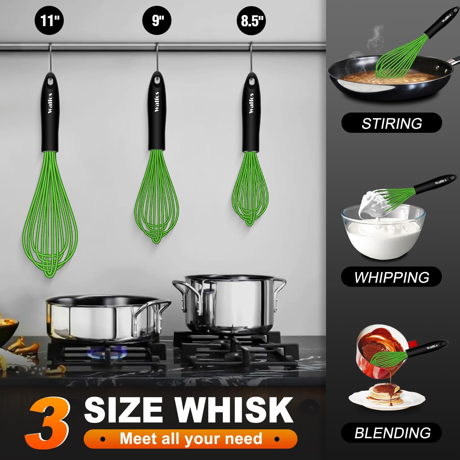 Walfos Silicone Whisk, Rubber Whisks for Cooking, Baking (11,9,8.5 inch) - Heat Resistant Kitchen Whisks for Non-stick Cookware, Balloon Egg Beater Perfect for Blending, Whisking, Beating, Frothing