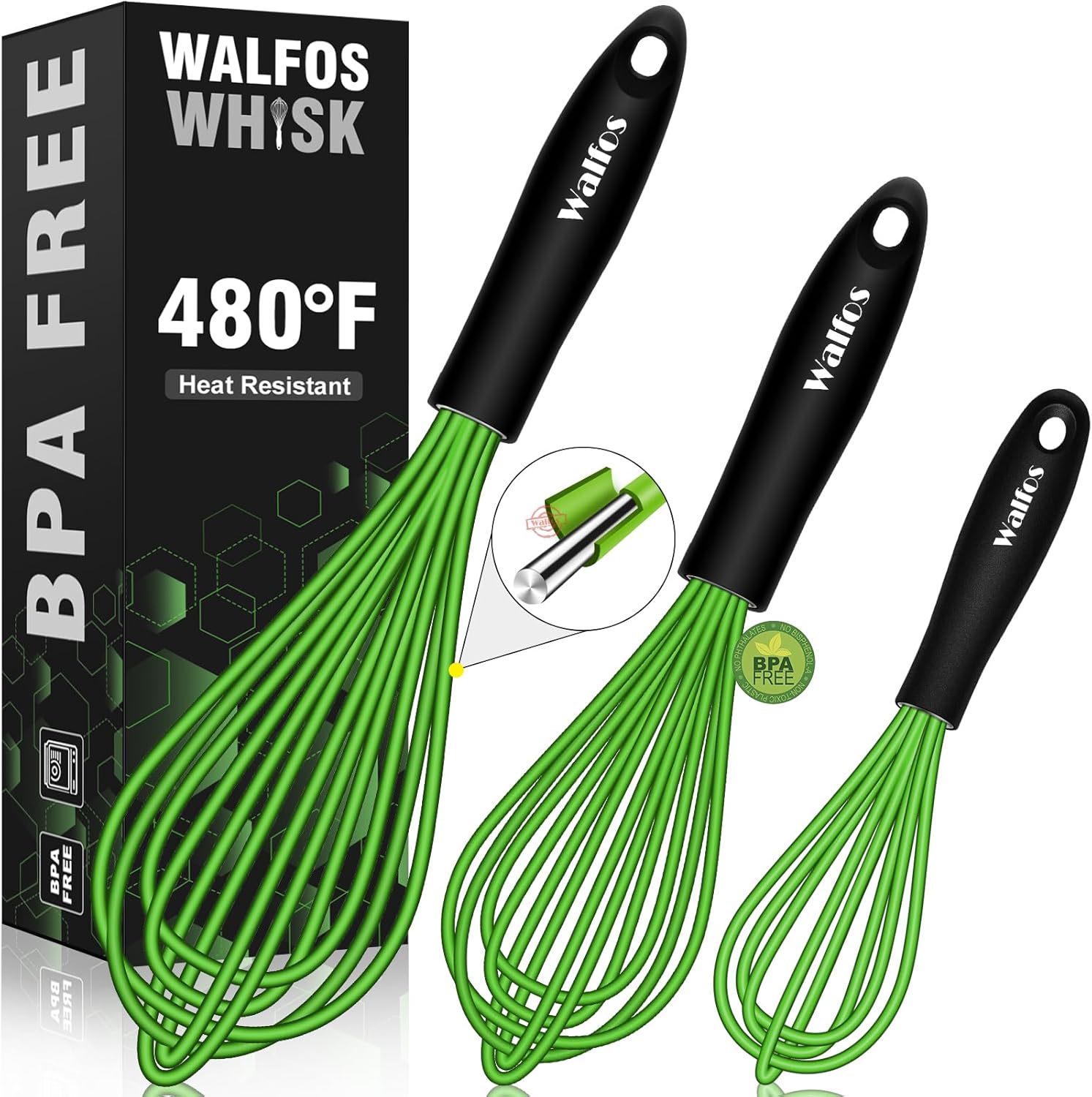 • Ergonomically plastic handle, provides you with a comfortable grip : Walfos Silicone whisk set has a 5 inch long handle, unique are design make it fit comfortably in the palm of your hand. The handle won't slip, even in wet hands