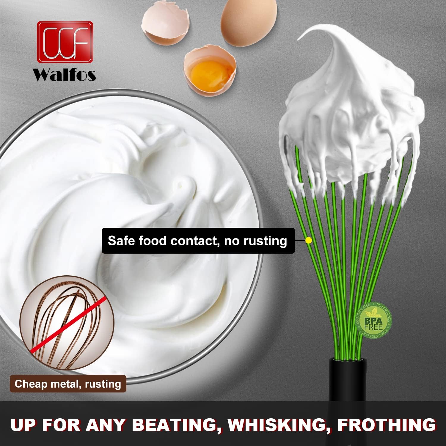 • Thickened silicone protective cover, stop scratching your cookware : Walfos whisk is made of 1.65 mm reliable stainless steel with wires non scratch coated coated in 0.3mm soft silicone, non-scratch whisks will not damage or scratch any of your pots, pans, bowls, or other dishes while you cook your favorite meals! , not rust, discolor, deform or melt.Bpa free The ultimate accessory for nonstick coated baking
