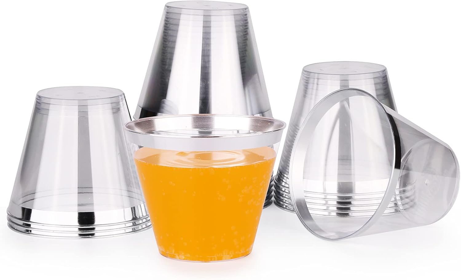 • PACKAGE: In our one-time meal/reusable set disposable dinnerware set, there are 12 oz cups with silver rims, pure white knives, forks, spoons, dinner plates, dinner paper. Each disposable dinnerware set is a 5-piece set