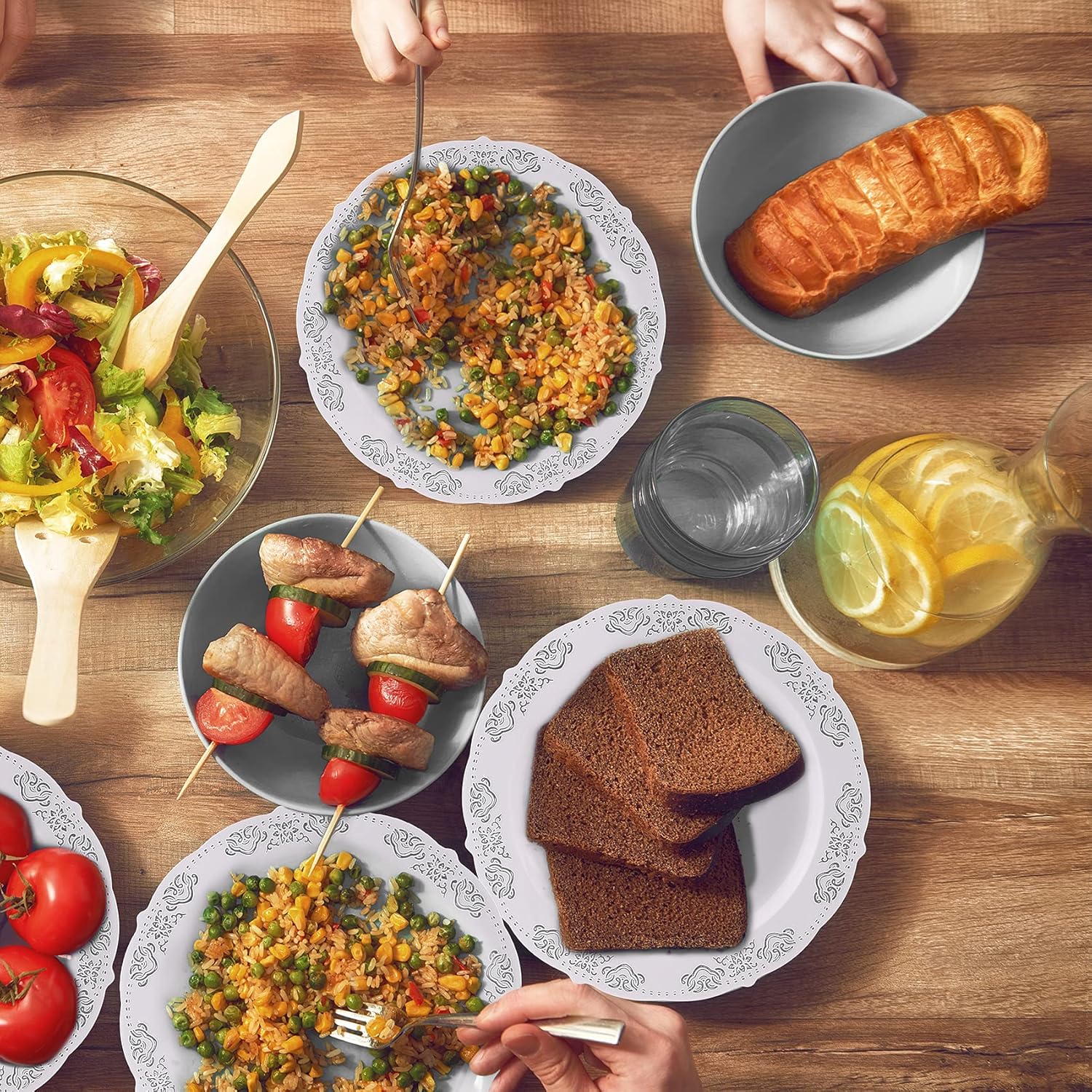 • MATERIAL: Our disposable silver plates and plastic silverware are BPA free and safe for you and your guests! Made of high-quality food-grade plastic to protect your healthy life