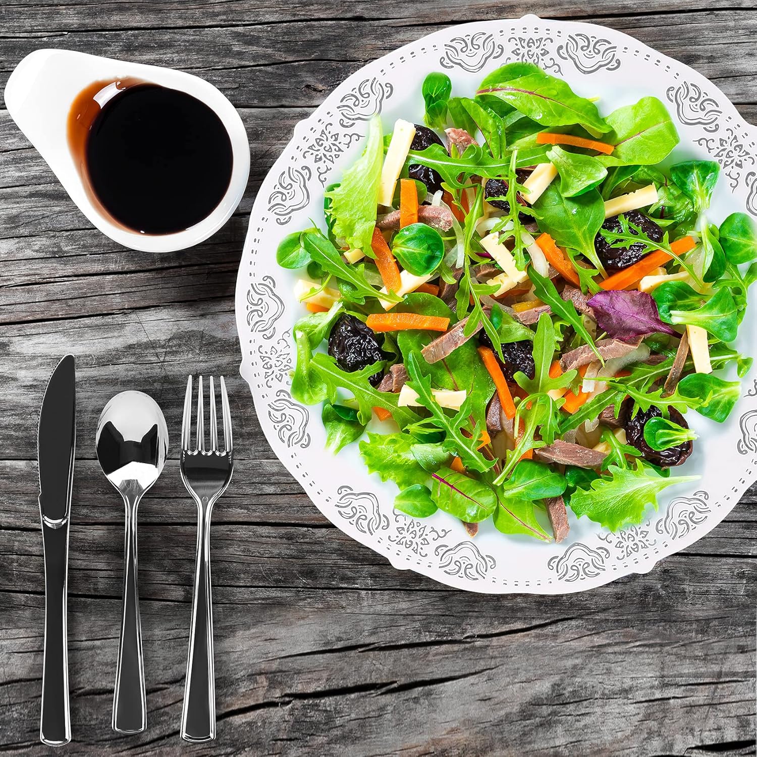 • FASHION DESIGN: The petals make the silver plastic plates like proud flowers. With the plastic handle cutlery, The more surprising is that it's plastic only you touch it, it's almost the same as ceramic