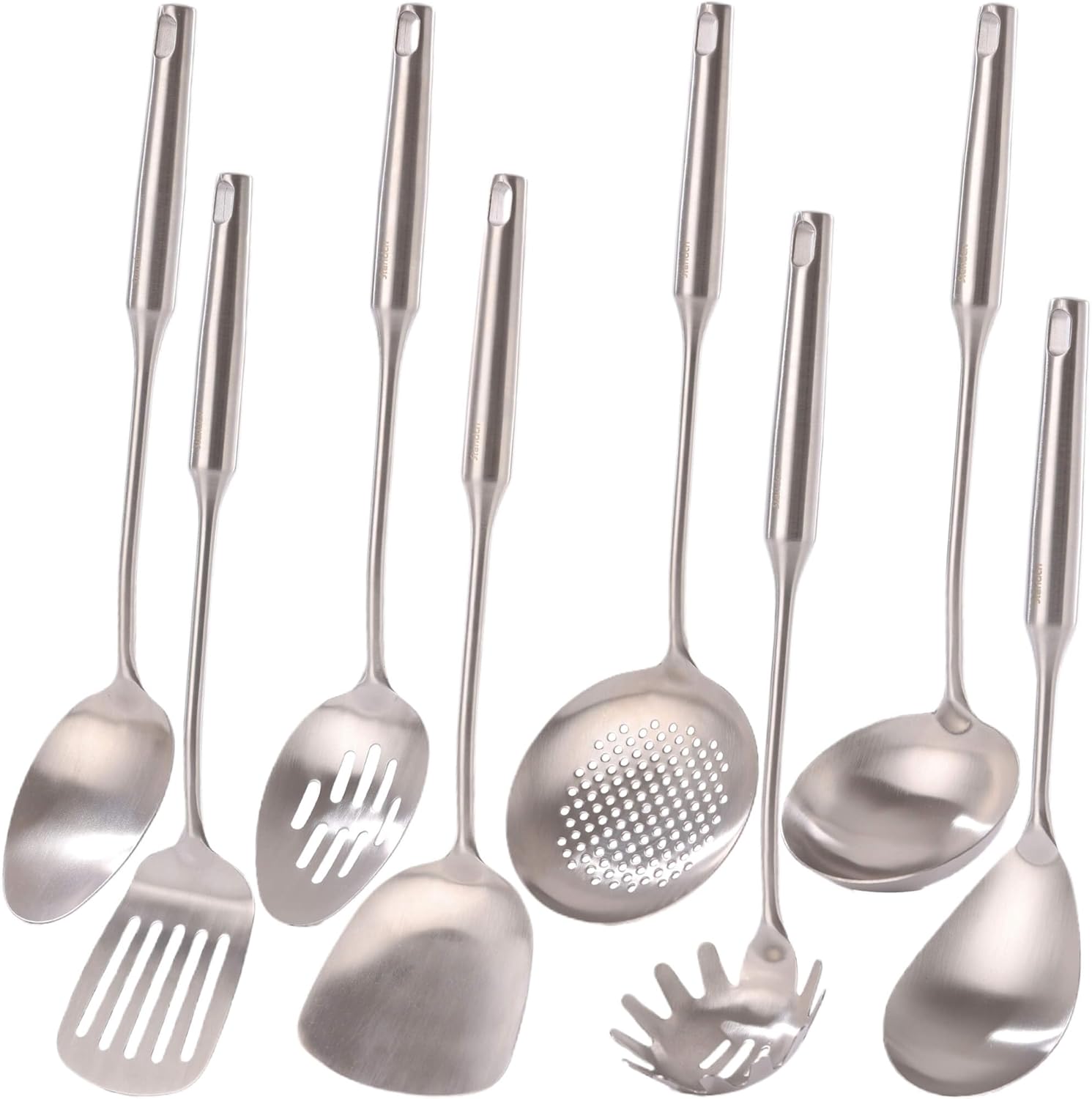 • 【High Quality Kitchen Utensils Set of 8】: Made of restaurant-quality 18/10 stainless steel(Highest grade in 304). Forged in one-piece with no welding or stress points, sturdy and durable. Fine matte brushed, unique shape and style