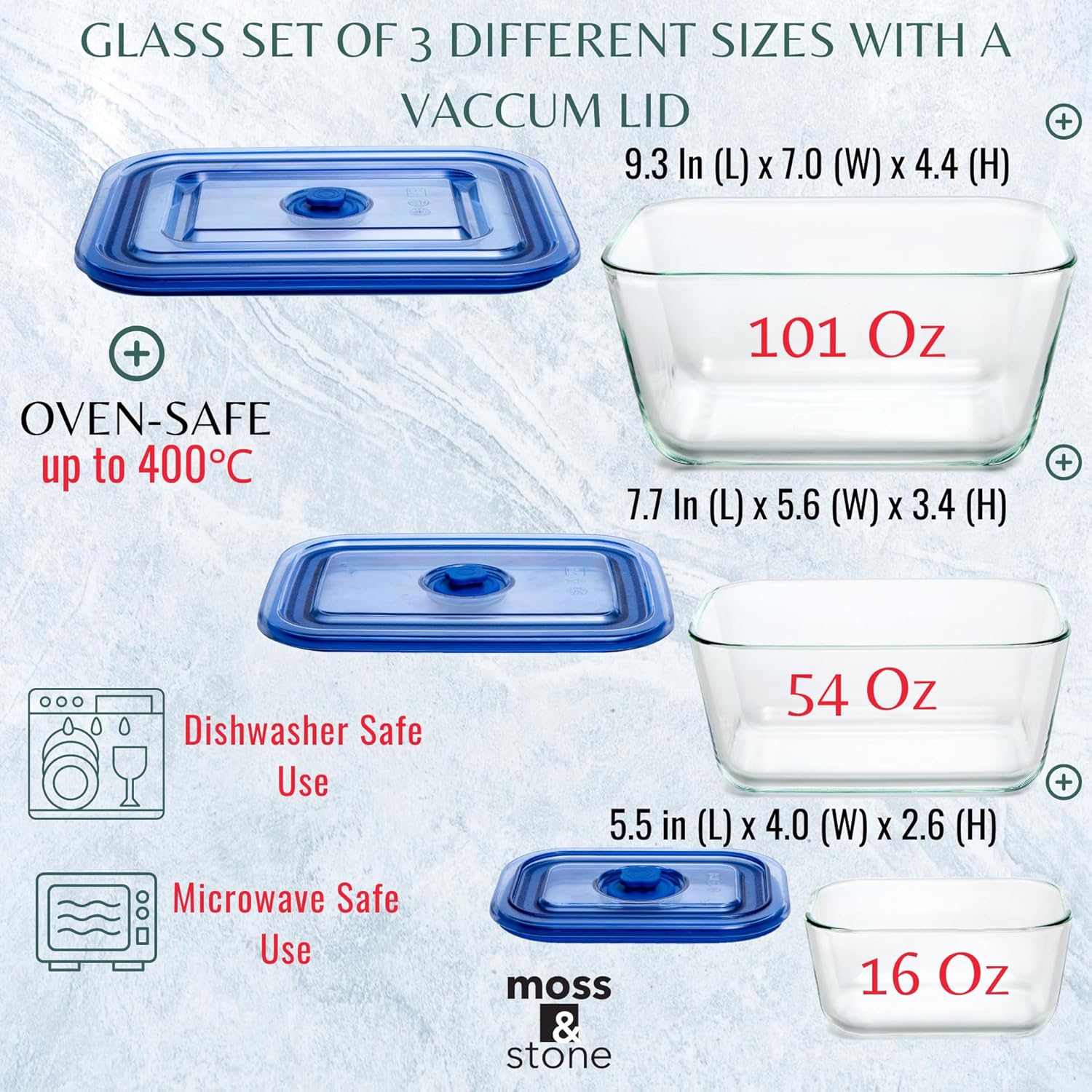 Moss & Stone Extra Large Glass Storage Containers With Lids Set of 3, 101 Oz/ 54 Oz/ 16 Oz, Deep Rectangular Glass Food Container with Lid, Leak Proof, Microwave, Dishwasher & Oven Safe