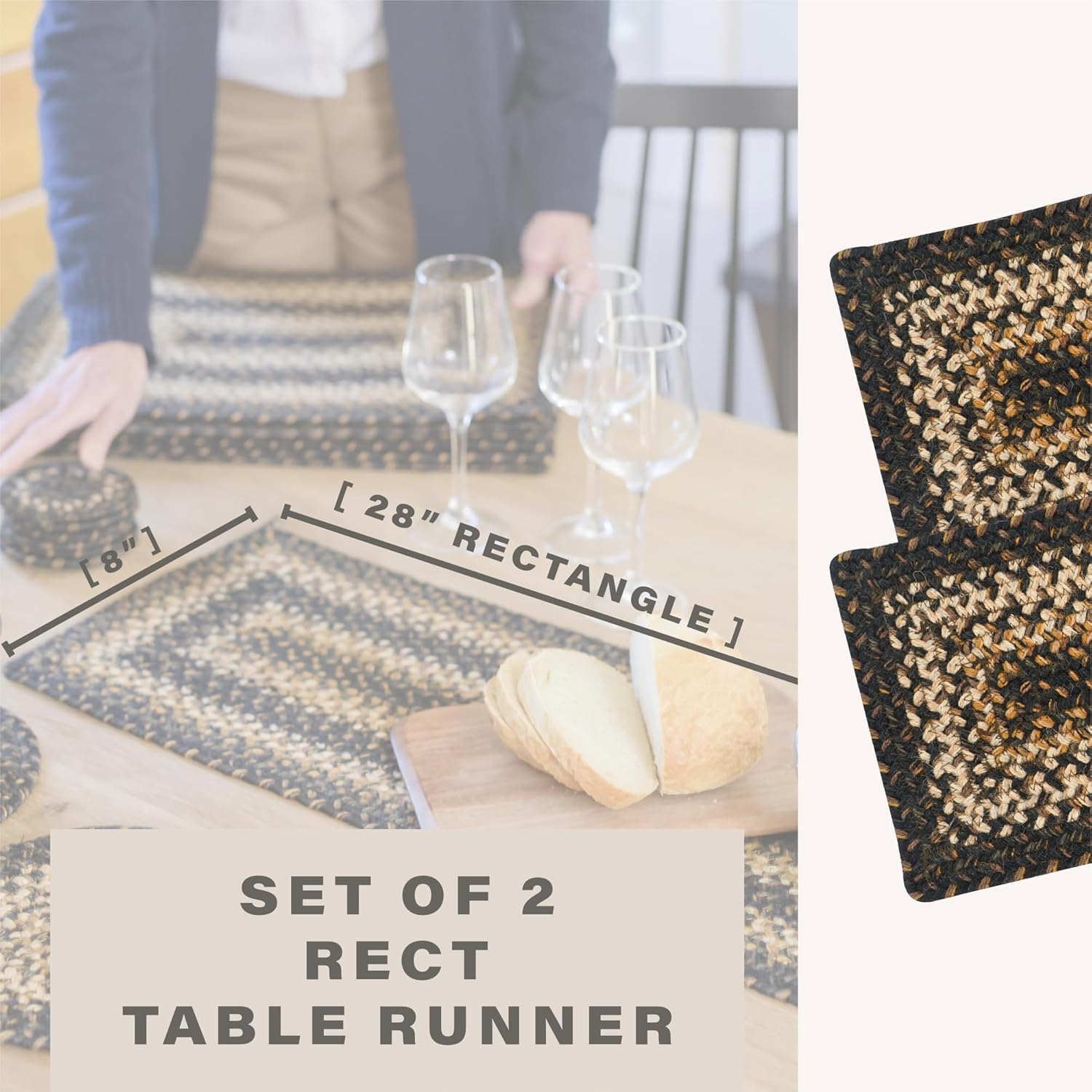 Homespice Kilimanjaro Jute Braided Small Table Runner, Warm Primitive Decor, Set of 2, Black and Brown Rectangle 8x28 - Rich Colors, Easy to Clean, Durable and Protects Furniture