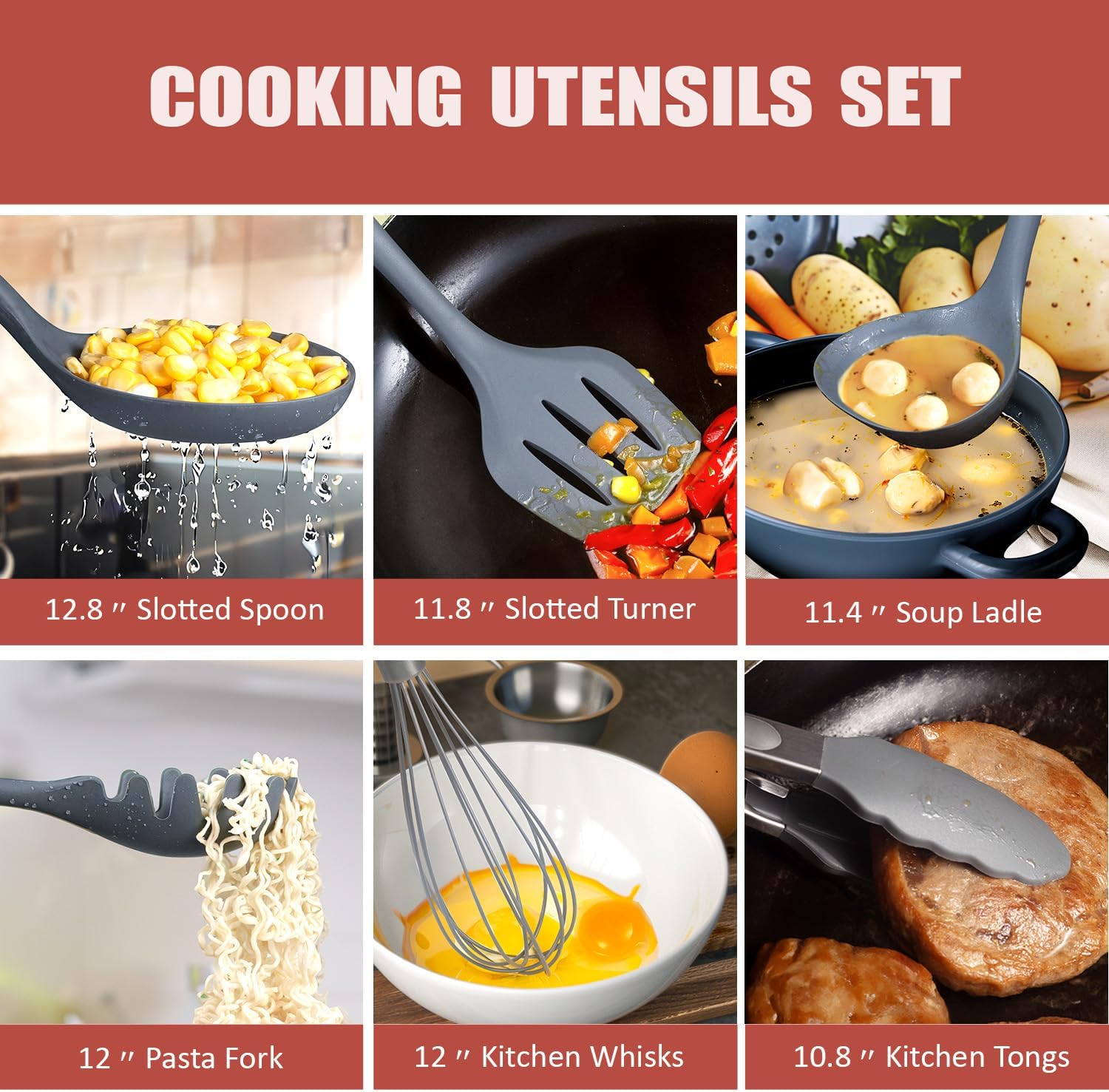 • Silicone Cooking Utensils Set: This Grey kitchen utensils made of food-grade silicone that can withstand with 210℃ temperatures, Including slotted turner, solid turner, soup ladle, whisks, kitchen tongs, pasta fork, slotted spoon,everything orderly housed in the holdor of utensil sets
