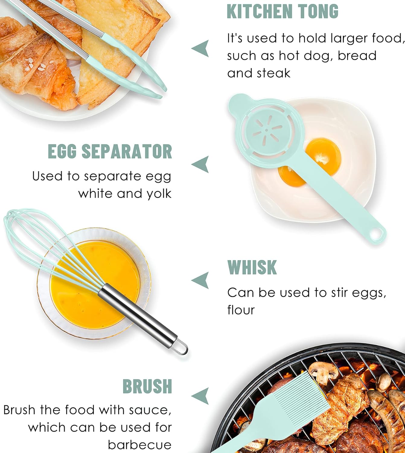 • ❤【12-Piece Kitchen Utensil Set】: This set of 12 essential kitchen tools includes ladle,pasta spoon,slotted turner,slotted spoon, kitchen tongs,basting brush,Holder, large spatula,small spatula, Holder,spoon spatula,whisk and Egg Separator. All items except the tongs and whisk are built out of one solid piece of silicone, making them more durable and comfortable to hold.