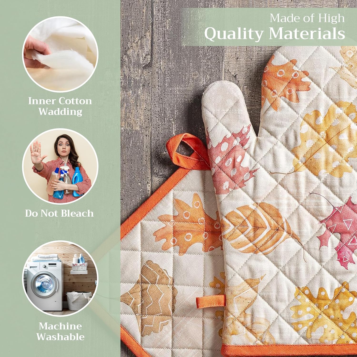 Maison d' Hermine 100% Cotton Oven Mitt & Pot Holder Set (7.5"x13" & 8"x8") Heat Resistant BBQ Cooking Gloves with Loop for Thanksgiving Christmas Decorations Handling Hot Pans (Colours of Autumn)