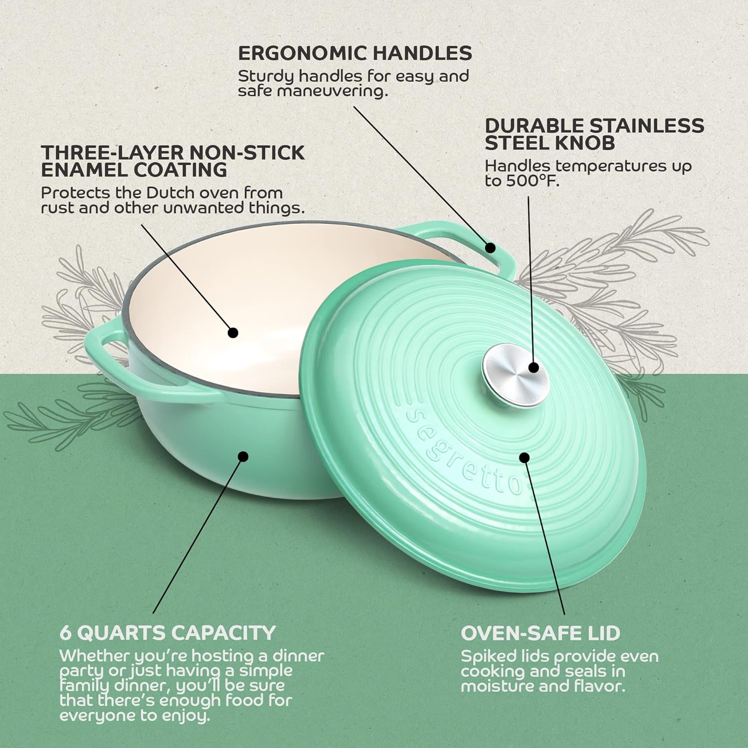 Segretto Cookware Enameled Cast Iron Dutch Oven, 6 Quarts, Light Green
