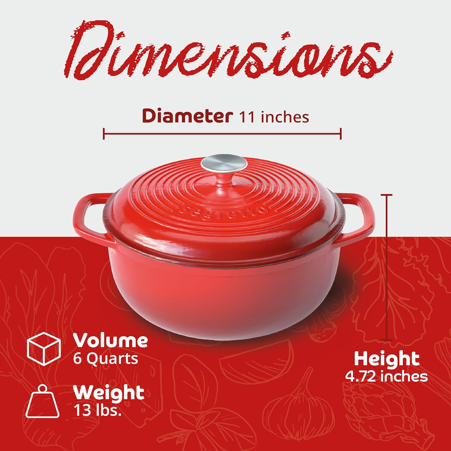 • LARGE CAPACITY ENAMELED CAST IRON DUTCH OVEN 6 QT. This heavy-duty enamel cast iron cookware is large enough to hold stews, soups, pot roasts, chilis, and more! Whether you’re hosting a dinner party or just having a simple family dinner with the Segretto Dutch Oven for Bread Baking, you’ll be sure that there’s enough food for everyone to enjoy. Second helpings are much welcome!