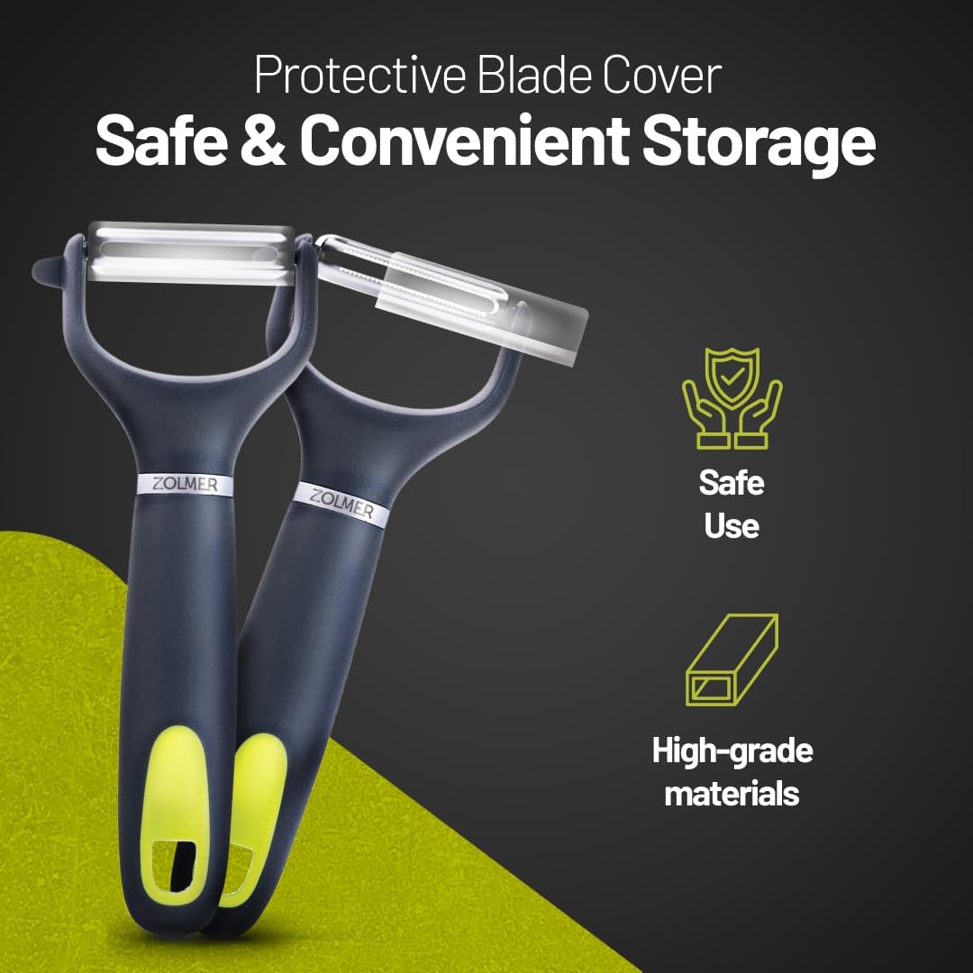 • ✅ EXTRA SHARP BLADES - The combination of razor-sharp stainless steel blades and an ergonomically designed handle of veggie peeler makes peeling food effortless.