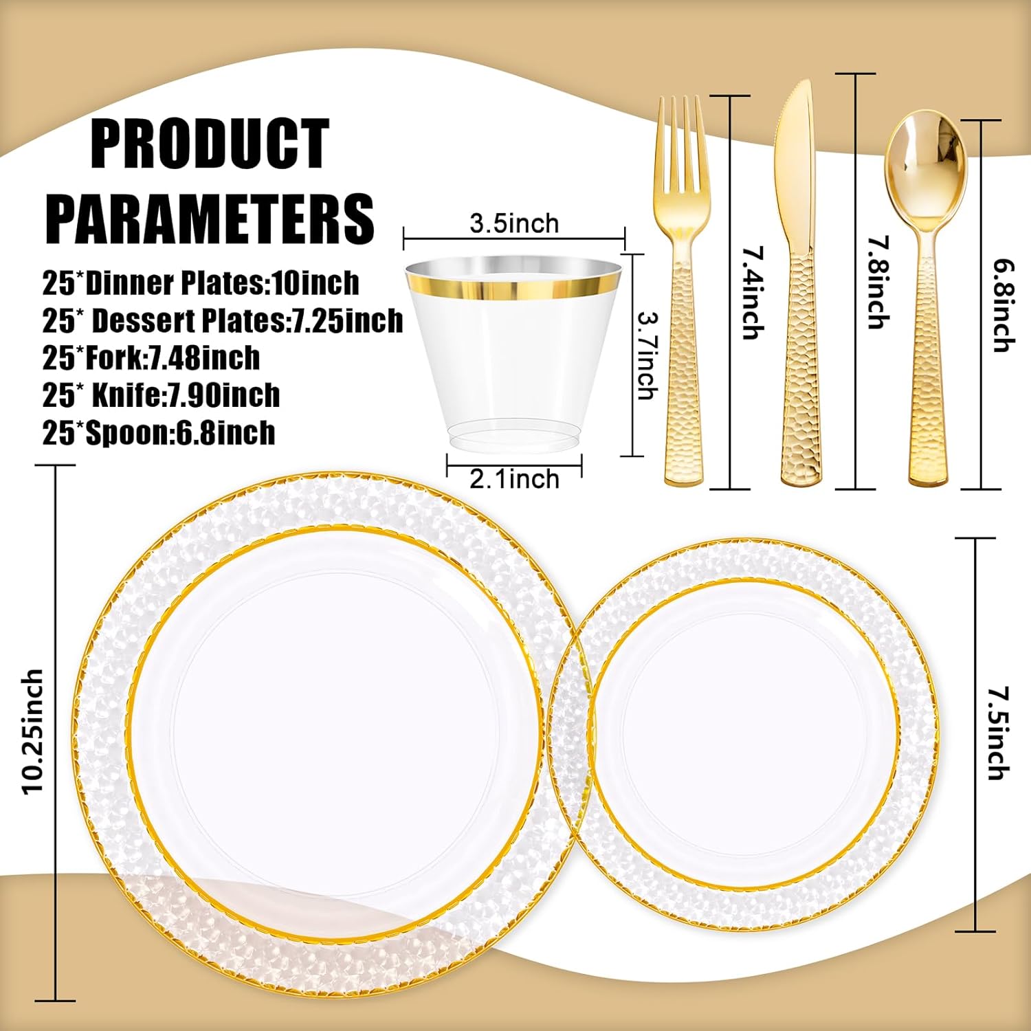 • Perfect for 25Guests: These clear gold plastic plates includes 25PCS 10.25inch dinner Plates, 25PCS 7.5inch dessert/salad Plates, 25 gold plastic forks, 25 gold plastic knives, 25 gold plastic spoons, 25 gold rim plastic cups. This set of gold plastic plates can meet your needs for serving 25 guests.