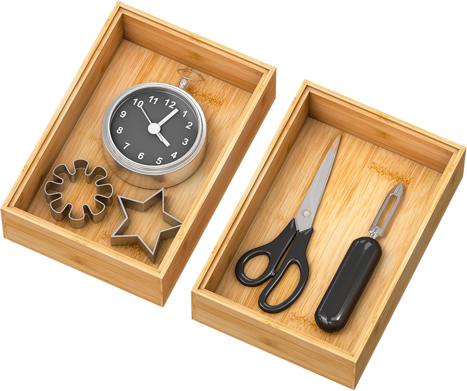 • 【2-Piece Bamboo Drawer Organizer Set】 An ideal deep drawer organizer for multi-purpose Use. As a kitchen drawer to organize silverware, utensil, cutlery, flatware, spoons, spatulas, whisks, wine stoppers, bottle openers etc; as a dresser drawer to organize makeup like lipstick, eyeliner, mascara, makeup brushes and more or as a desk drawer to keep pens, paper clips, staples and other supplies organized.Make eachwhere more neater.