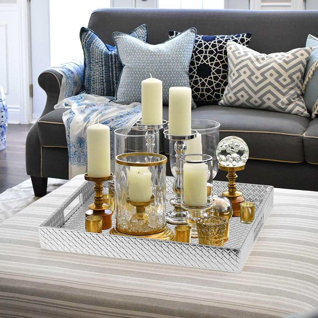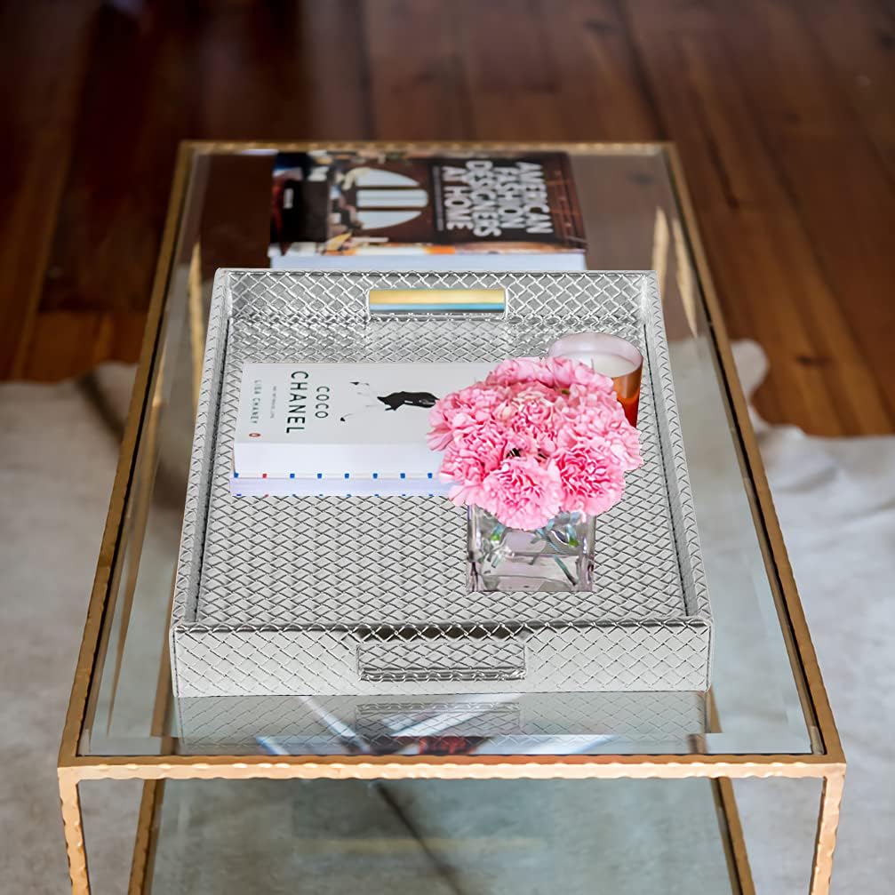 HofferRuffer Rectangle Serving Tray with Hole Handles for Coffee Table, Breakfast, Tea, Food, Butler - Countertop, Kitchen, Vanity Serve Tray, 16.2 x 12.2 x 2 inches, Faux Leather (Silver)