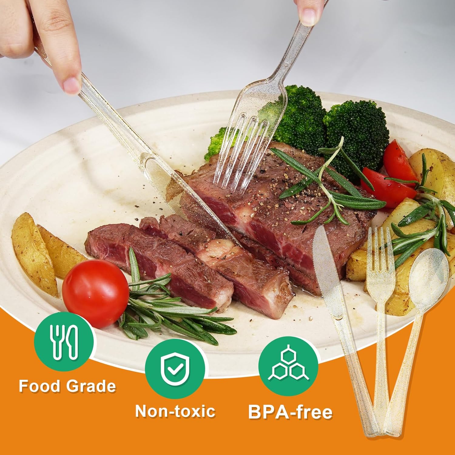 300PCS Plastic Silverware Set, Disposable Glitter Gold Cutlery, Flatware Set, 100 Forks, 100 Spoons, 100 Knives, Fancy Party Utensils for Christmas