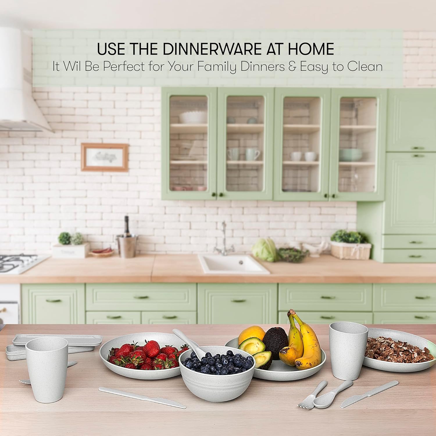 • Multipurpose Dinnerware - Our reusable dishes set for 8 are made for every occasion and will not only be great for home and kitchen use, but also convenient for an rv or camper, a picnic, BBQing, camping, work, school and much more. The unique design allows for easy compact storage as well. You can't go wrong with our wheatstraw dinnerware set.