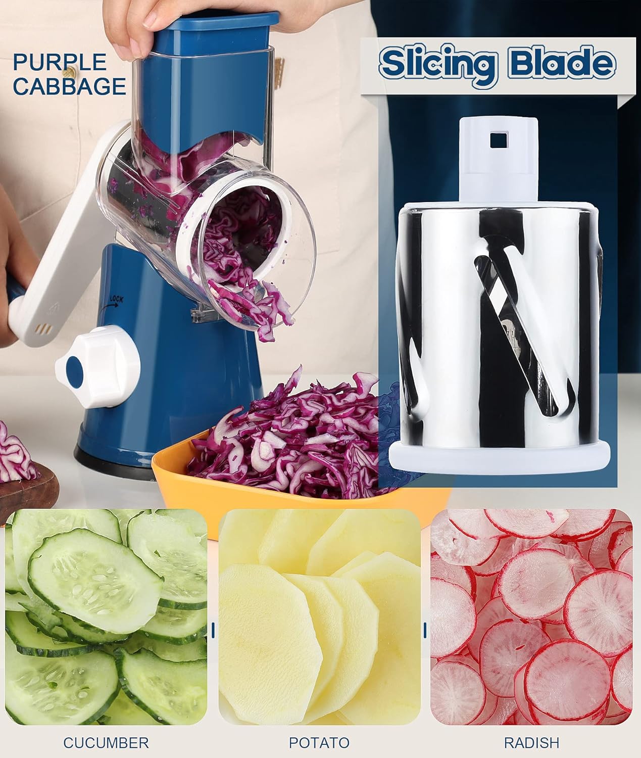 Ourokhome Rotary Cheese Grater Hand Crank, Kitchen Shredder Speed Mandolin Slicer Nut Grinder with Handle and Drum Blades for Cheese, Vegetable, Walnut, Chocolate, Potato, Carrot, 3 Blades, Dark Blue