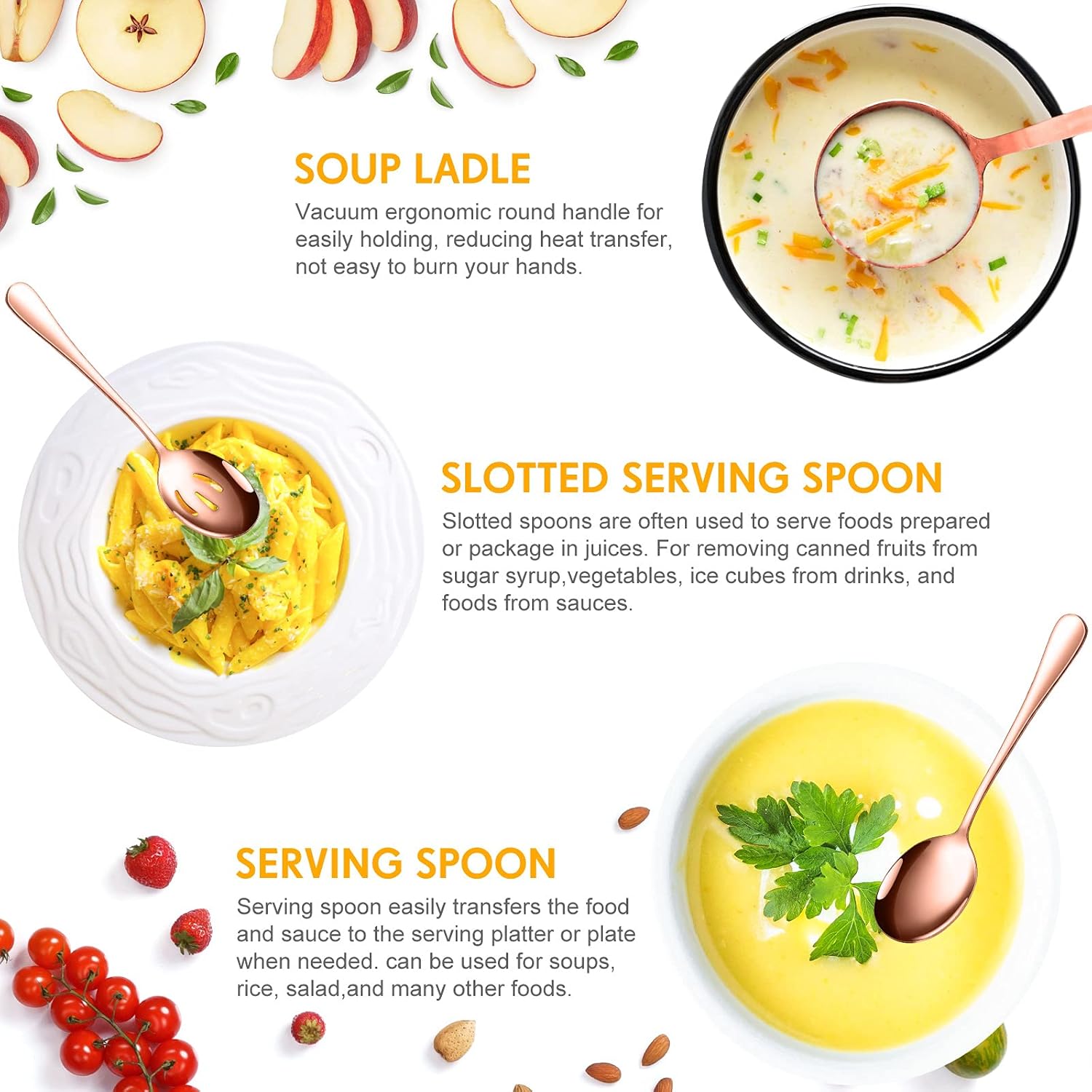 • Humanized Design: smooth humanized handles of these pie server, soup ladle, serving spoon, slotted spoon and fork make serving easy, proper size and nice weight ensure comfortable hand feel; The serving tong also comes with humanized design, proper long handle makes it easy to pick up food