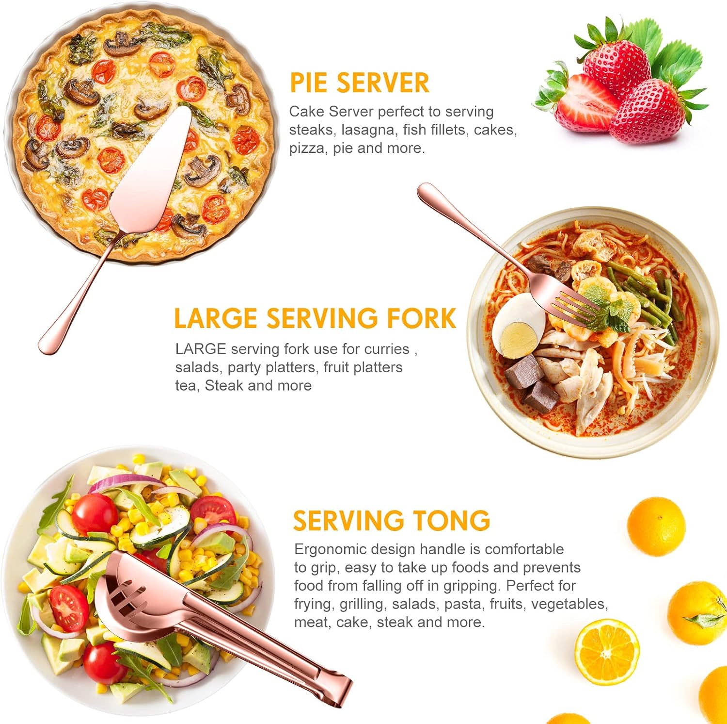 Patelai Serving Utensils Set Include Stainless Steel Large Spoons Slotted Spoons Forks Tongs Soup Ladle and Pie Server for Parties Buffet Catering, Dishwasher Safe(Rose Gold,10 Pieces)