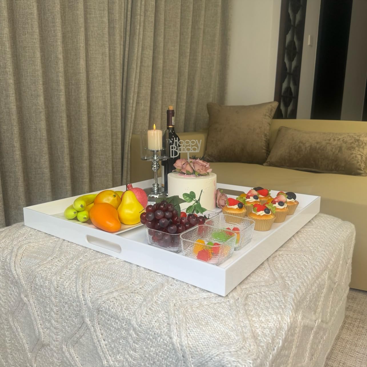 White Acrylic Ottoman Tray with Cutout Handles 24x24 Inch Over-Sized Serving Tray Rubber Boot Organizer Decorative Tray for Living Room, Bedroom,Bathroom Entryway and Kitchen Tabletop