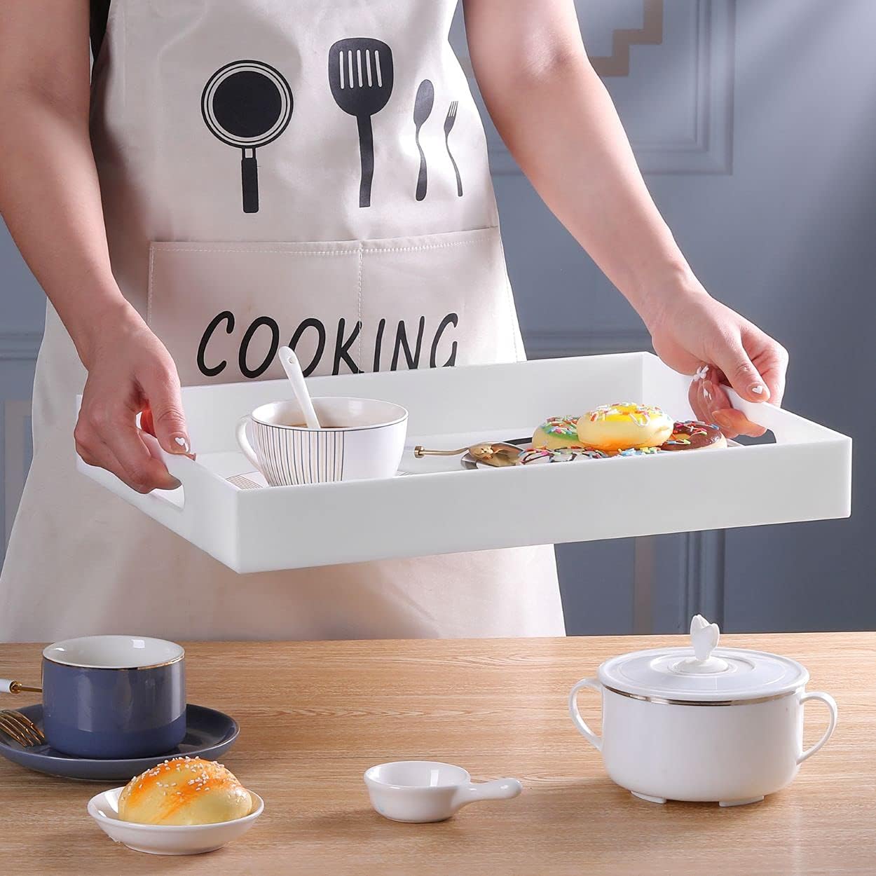 • Multifunctional- Serving tray for serving breakfast, appetizers, coffee, drinks, desserts, snacks, fruit, cheese, food; Decorative organizer tray for cosmetics, jewelry, remote, glasses, ornaments, magazines. Tray can be put on an ottoman, bed, coffee table and couch. It’s elegant to be put on any tabletop or countertop as an accessory.