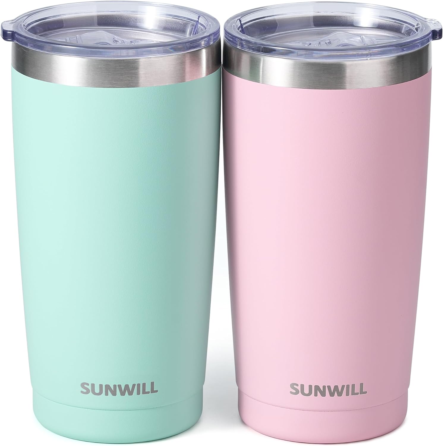 SUNWILL Travel Coffee Mug with Lid, 20 oz Tumbler Set of 2, Insulated Stainless Steel Cup for Water, Tea, Powder Coated Sakura & Mint