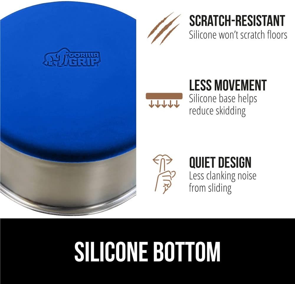 • SILICONE BOTTOM: the Gorilla Grip bowl is constructed from durable silicone that helps keep the bowl steady and won’t scratch your floors; while some over eager eaters may still be able to slide the bowls, the silicone will help prevent much movement; plus, it reduces the noise from clanking and sliding across wood, tile, and more