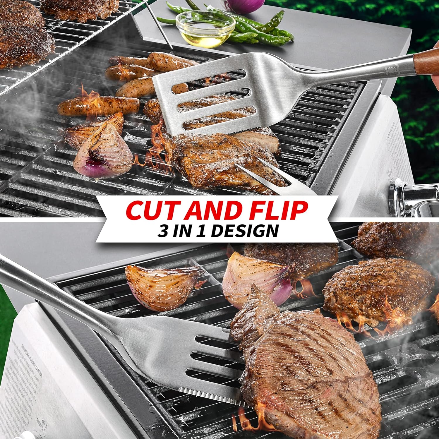 • 3-๐—ถ๐—ป-1 ๐˜€๐—ฝ๐—ฎ๐˜๐˜‚๐—น๐—ฎ: Having a hard time with cutting and grilling? This 3 in 1 spatula with serrated edge is the perfect tool for you. It will make your grilling experience easier and faster. The bottle opener is located at the top of the handle, both for the kitchen grill spatula and forks. It's a multi-functional grilling tool that will make your life much easier!