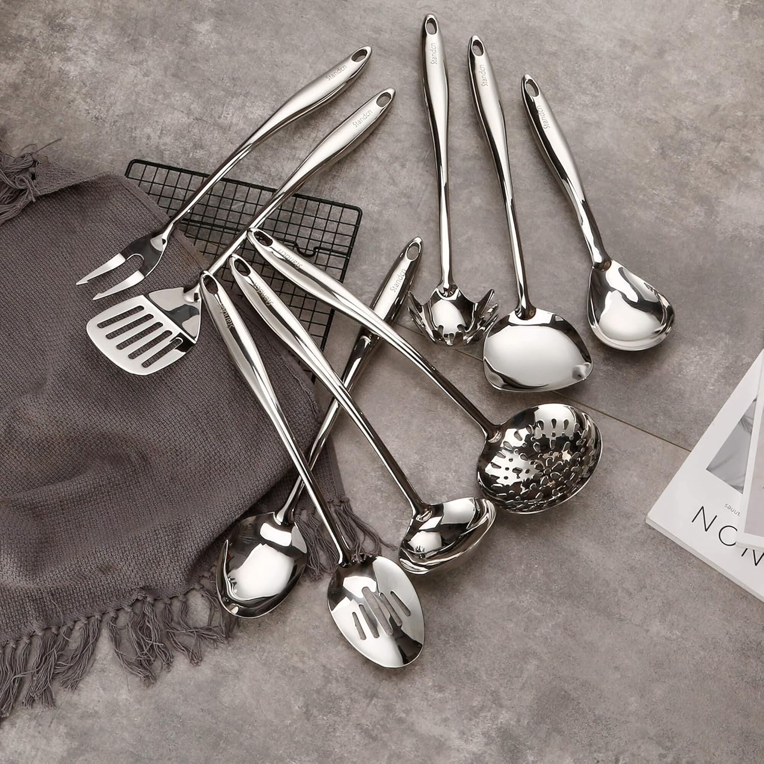 • 9-Pieces, 1 meat fork, 1 solid serving spoon, 1 slotted serving spoon, 1 spatula, 1 skimmer spoon, 1 slotted spatula turner, 1 large spoon, 1 spaghetti spoon, 1 soup ladle. These premium utensils are safe to use for cooking any type of food, It is also a great gift for friends and family who love cooking with metal kitchen utensils, and be sure to be asked where you bought it