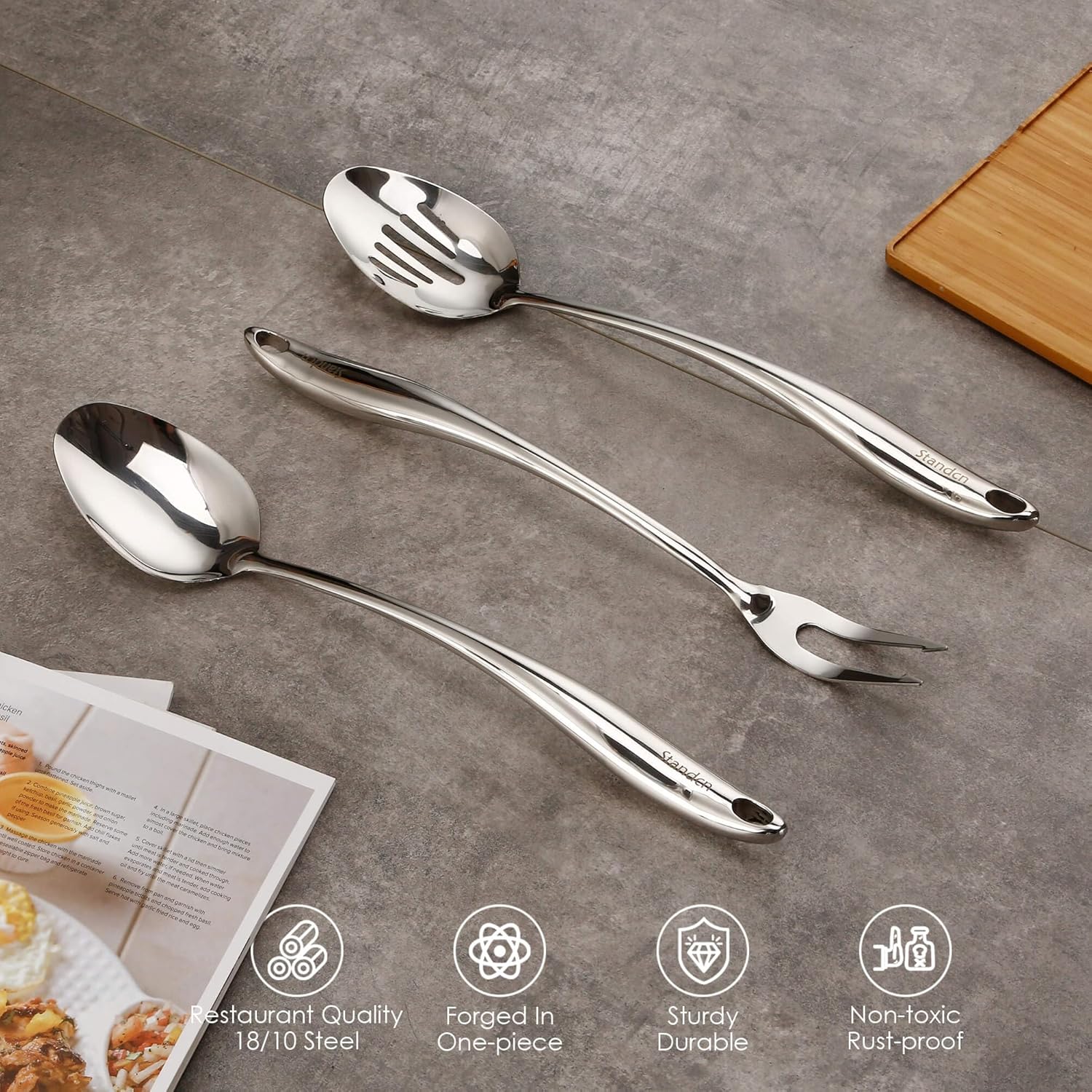 • 15inch lightweight cooking spoons, ergonomic design, precise balance, excellent grip, long handle to provide high heat resistant, make sure the chef's hands stay cool(The large hollow handles make it slightly lighter than Standcn's other utensils)