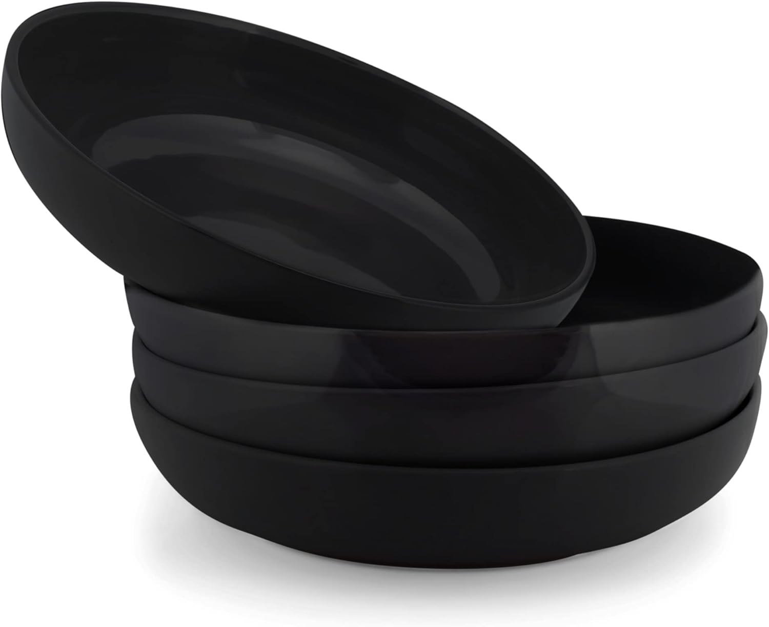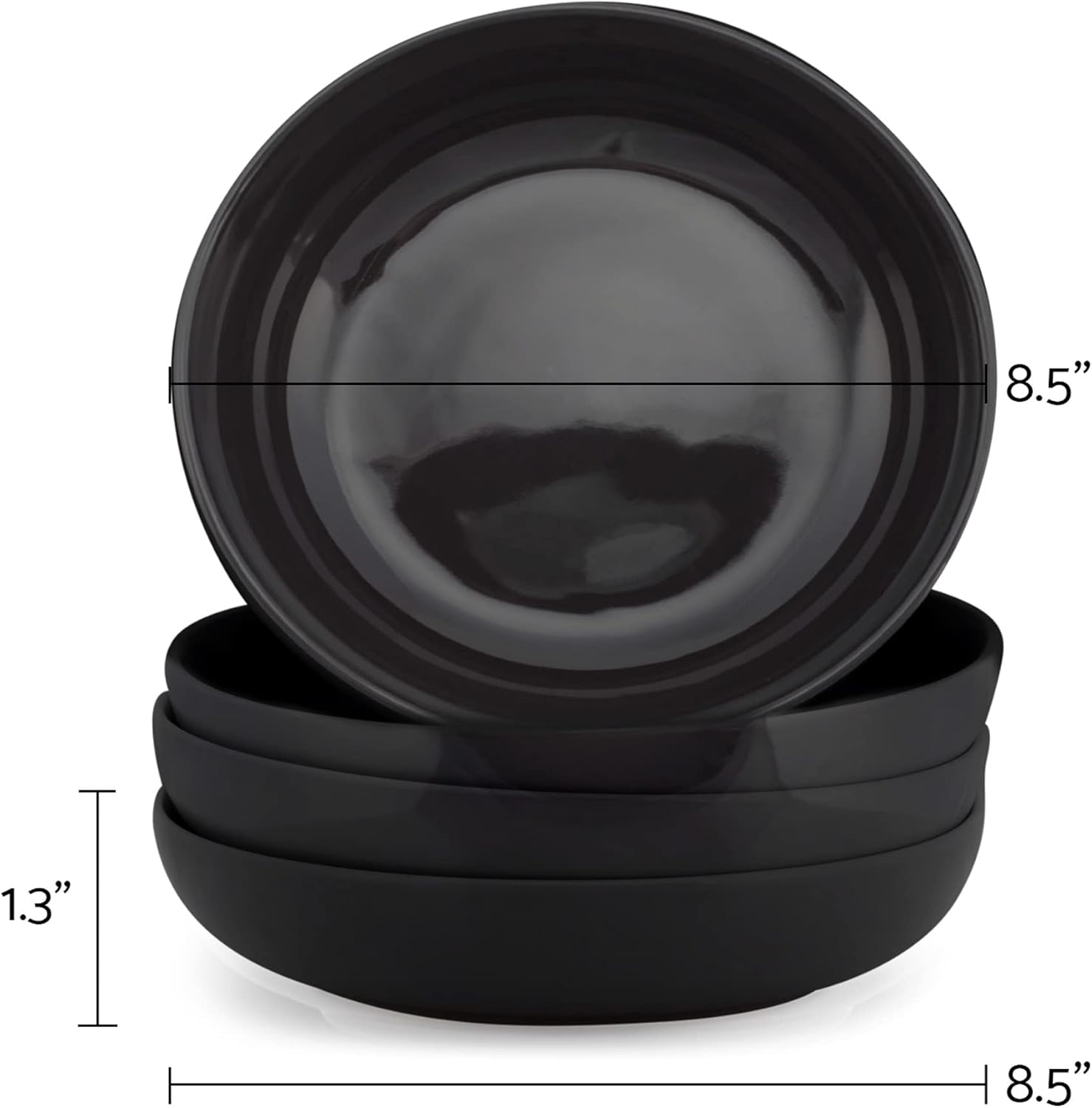 Elanze Designs Bistro Glossy Ceramic 8.5 inch Shallow Pasta Dinner Bowls Set of 4 - Perfect for Everyday uses from Italian Style Pasta to Caesar Salad, and Ramen to Pho, Black