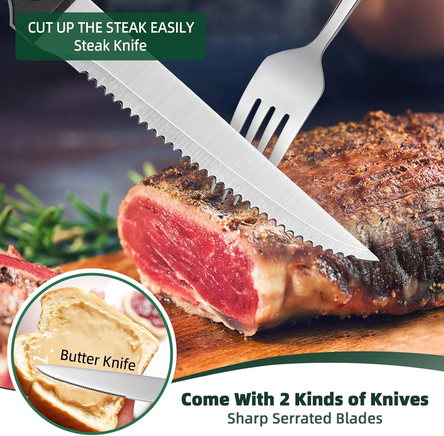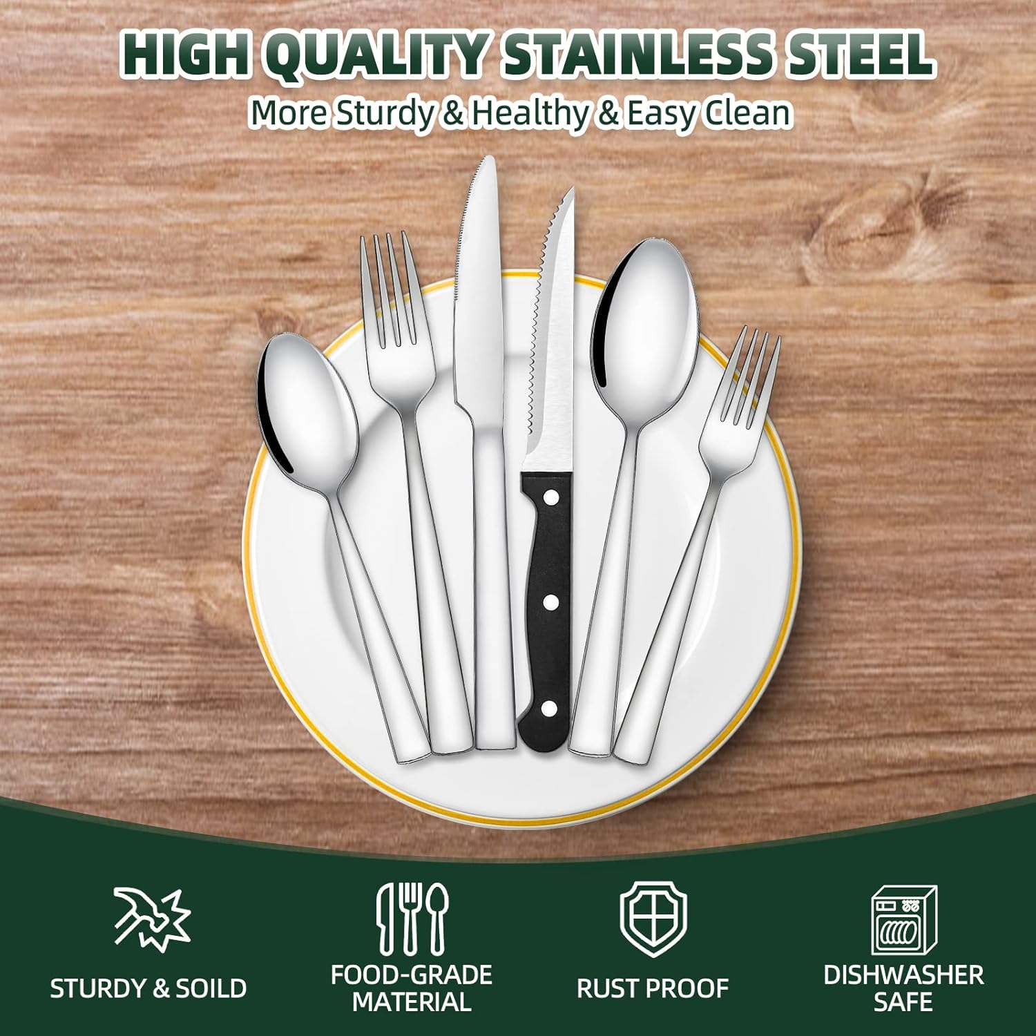 • Included Components : Including 8 Dinner Forks, 8 Salad Forks, 8 Dinner Spoons, 8 Tea Spoons, 8 Dinner Knives and extra 8 Steak Knives. Including 8 Dinner Forks, 8 Salad Forks, 8 Dinner Spoons, 8 Tea Spoons, 8 Dinner Knives and extra 8 Steak Knives.