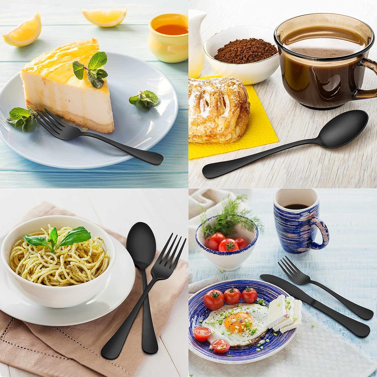 • Service for 4, 20 piece matte flatware set includes 4 dinner knives, 4 dinner forks, 4 dinner spoons, 4 salad dessert forks, 4 teaspoons, plus a silverware drawer organizer, this 20pcs eating utensils set is great for your daily use, also suitable to entertain your family, friends and guests